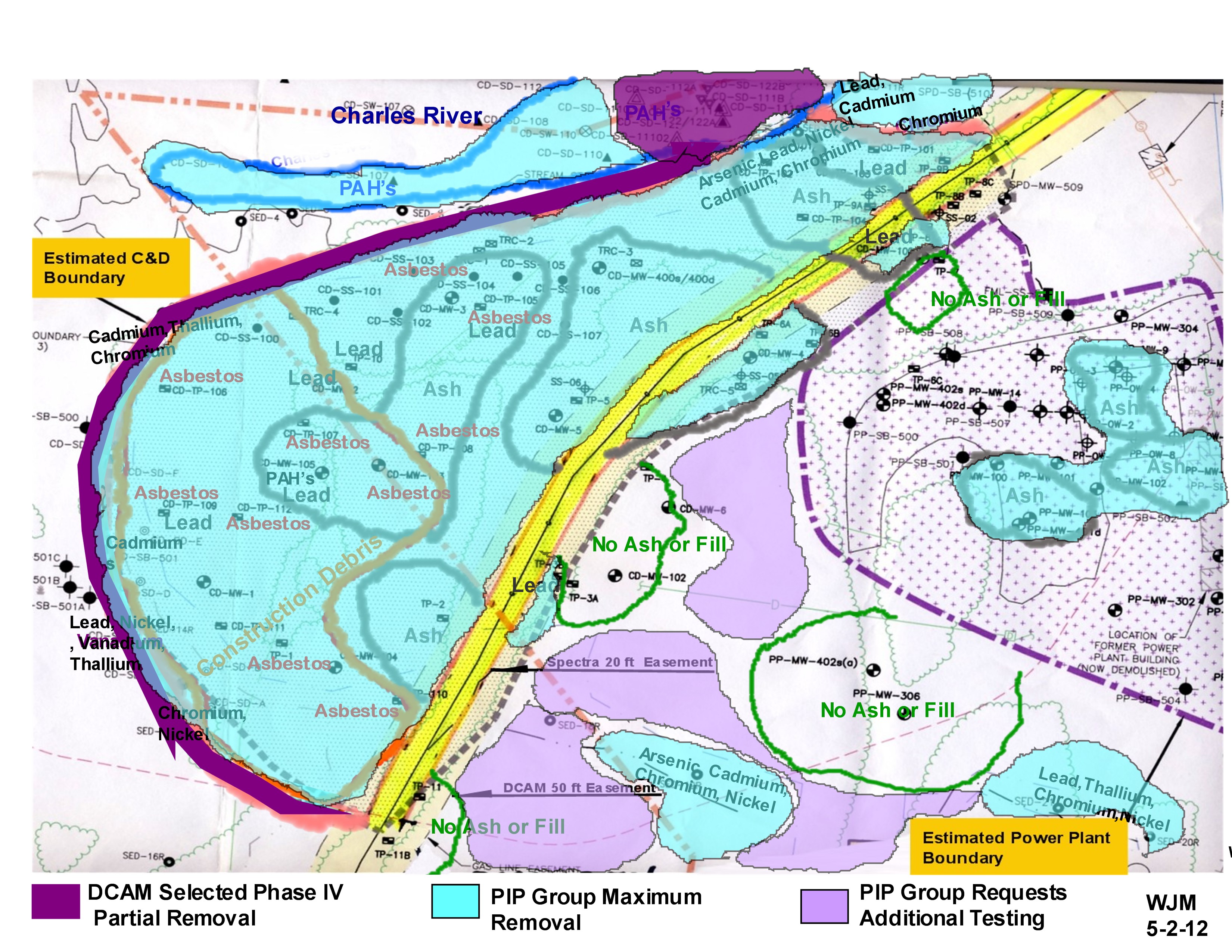 This one shows my conception of what DCAM is removing in dark plum; what I think our residents’ “maximum extent feasible removal” is in blue; and areas where we need additional testing ( likely also to need to be removed) in light purple. I also added some additional contaminants of concern with input from Andrea. It should pretty much agree with Town and PIP Phase II & Phase III comments submitted on 4/24/12.