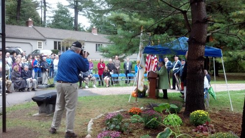 This morning a crowd of over a hundred people gathered at Causeway Street and Claypit Road to dedicate a new civic square in honor of Bobby Naughton, former officer in the MPD. The ceremony was organized by Richard DeSorgher, with remarks by former Chief Bill Mann, town administrator Mike Sullivan, and Veterans Service Officer Ron Griffin. All agreed that Bobby was friendly, kind, personable, brave, and had strong interests in nature, archeology, boats, and life in general. This writer met him few times, but recalls the warmth and focus he brought to bear. As Tracy Mitchell said when Bobby died, Medfield lost a great man who simply cannot be replaced.