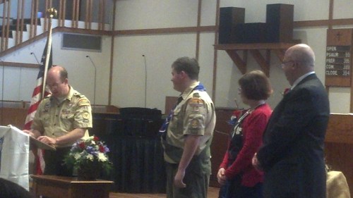 Kyle Cuccia receiving his eagle scout award this afternoon at St. Edwards, with scoutmaster David Derian at the podium and Kyle's parents to his right.
