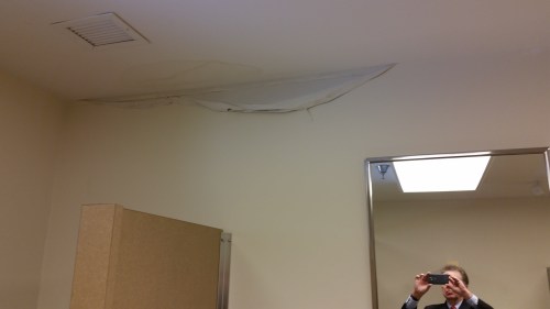 This one shows the wall paper pealing due to the leak into the men’s room.