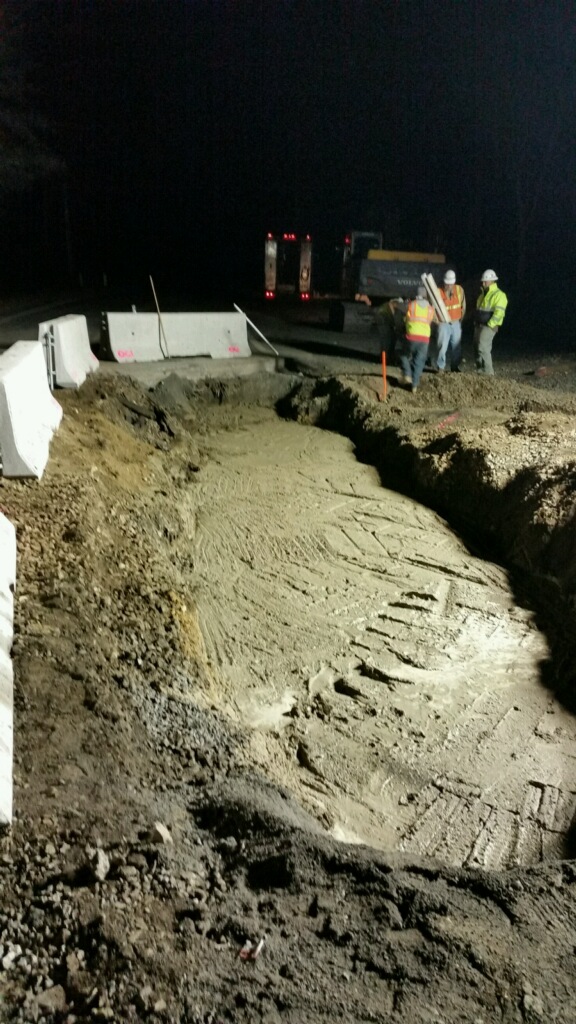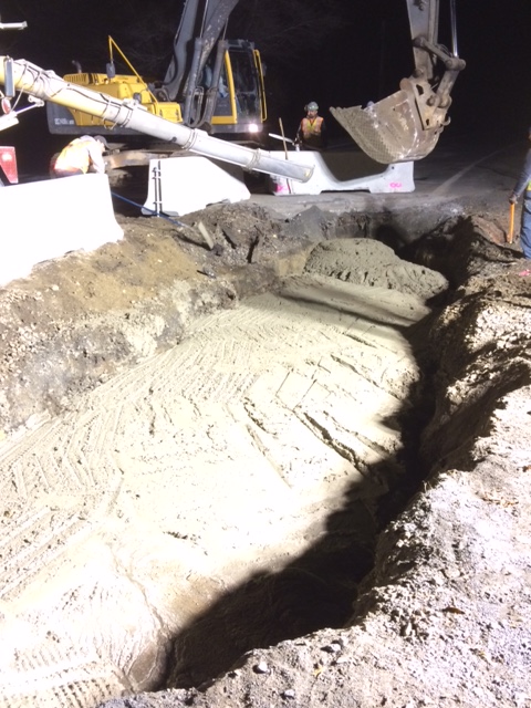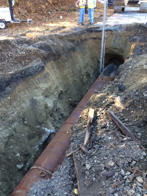 Long day but Oliviera Construction did a good job. The 42″ casing …a 40 foot long section…is in as shown in the photographs and the excavation is now backfilled with 7 truck loads of specified flowable fill (similiar to a concrete mix but it sets up hard and is removable by an excavator). The local concrete supplier was late with his delivery of the last 4 truck loads.