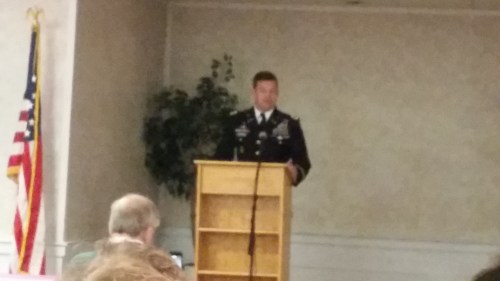 Lt. Cornell Alexander Stephenson gives the Memorial Day address at the Legion this morning. Alex is a1991 graduate of MHS, and the son of David Stephenson, the proud father whose head can be seen in the photo. Alex recalled two of the more than 30 colleagues of his who died in the recent American wars, heros who were like us, except that they gave their lives for the protection of our country’s way of life.