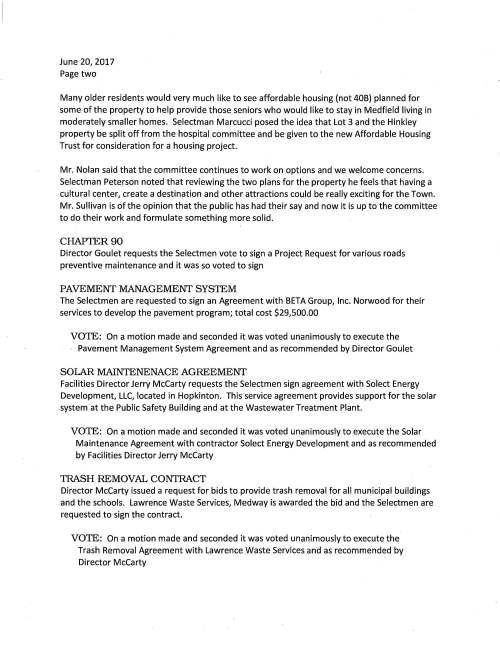 Meeting Minutes June 20, 2017 Chenery Meeting Room draft PRESENf: Selectmen Peterson, Marcucci; Town Administrator Sullivan; Administrative Assistant Clarke; Selectman Murby absent Chairman Peterson called the meeting to order at 7:00. He announced this meeting is being recorded and asked for a moment of appreciation for our Troops serving in the Middle East and around the world. POLICE DEPARI'MENf As Chief Meaney was not available this evening, Sgt Wilhelmi is present to explain the Delegation Agreement between Medfield Police and MASS Human Resources Division pertaining to the selection process for police sergeant. Civil Service will now allow the sergeant exam and assessments to be available locally. Chief Meany will be the Delegation Administrator to ensure that all aspects of the exam will be adhered to. Exam results will be available in three weeks and the cost to the Town to administrator the exam process is minimal. The Board is requested to authorize Chairman Peterson execute the document and it was so voted. MEDFIELD ARI'S INITIATIVES / JEAN MINEO AND CHRISTINE POTTS Jean Mineo gave the Selectmen a printout of "Economic Impact" regarding cultural events in Town. Medfield was one of 341 organizations country wide participating and she was happy to report that the 17 arts and cultural institutions in Medfield has been recognized as an excellent supporter for cultural events. The event "Arts in the Park" is planned for Thursday June 22 to highlight artists and their works in Straw Hat Park. Also a new banner will be on display that reads "We Celebrate Medfield Arts" and highlights those sponsors and supporters of all things cultural. Chris Potts remarked that the Town has a banner gift account and requests the Selectmen approve the cost of the banner, $265.00 to be paid from this account. VOTE: On a motion made by Selectman Marcucci, seconded by Selectman Peterson it was voted unanimously to authorize payment of $265.00 to cover the cost of a new banner and as requested by the Medfield Cultural Council STATE HOSPITAL MASTER PLANNING COMMITIEE Chairman Steve Nolan remarked that his committee has agreed that we will not be ready to present a plan for the site at a Special Town Meeting in November but rather tentatively aim for a meeting in January. He continued saying that the one consistent proposal that has been voiced from the public outreach meetings is that the focus should be on the Town reaching the 10 percent for affordable housing and safe harbor. June 20, 2017 Page two Many older residents would very much like to see affordable housing (not 40B) planned for some of the property to help provide those seniors who would like to stay in Medfield living in moderately smaller homes. Selectman Marcucci posed the idea that Lot 3 and the Hinkley property be split off from the hospital committee and be given to the new Affordable Housing Trust for consideration for a housing project. Mr. Nolan said that the committee continues to work on options and we welcome concerns. Selectman Peterson noted that reviewing the two plans for the property he feels that having a cultural center, create a destination and other attractions could be really exciting for the Town. Mr. Sullivan is of the opinion that the public has had their say and now it is up to the committee to do their work and formulate something more solid. CHAPTER90 Director Goulet requests the Selectmen vote to sign a Project Request for various roads preventive maintenance and it was so voted to sign PAVEMENT MANAGEMENT SYSTEM The Selectmen are requested to sign an Agreement with BETA Group, Inc. Norwood for their services to develop the pavement program; total cost $29,500.00 VOTE: On a motion made and seconded it was voted unanimously to execute the · Pavement Management System Agreement and as recommended by Director Goulet SOLAR MAINTENENACE AGREEMENT Facilities Director Jerry McCarty requests the Selectmen sign agreement with Select Energy Development, LLC, located in Hopkinton. This service agreement provides support for the solar system at the Public Safety Building and at the Wastewater Treatment Plant. VOTE: On a motion made and seconded it was voted unanimously to execute the Solar Maintenance Agreement with contractor Select Energy Development and as recommended by Facilities Director Jerry McCarty TRASH REMOVAL CONTRACT Director McCarty issued a request for bids to provide trash removal for all municipal buildings and the schools. Lawrence Waste Services, Medway is awarded the bid and the Selectmen are requested to sign the contract. VOTE: On a motion made and seconded it was voted unanimously to execute the Trash Removal Agreement with Lawrence Waste Services and as recommended by Director McCarty June 20, 2017 Page three WEBSITE SERVICES Ms. Trierweiler and the IT Team recommend that CivicPlus, Manhattan, Kansas be retained to provide a website redesign for the Town. Fee for services is $29,882.00. The Board is requested to sign the agreement and it was so voted. LETTERS OF RESIGNATION VOTE: On a motion made by Selectman Marcucci, seconded by Selectman Peterson it was voted unanimously to accept the resignation of Council on Aging Board member Neil Du Ross, member since 2006 VOTE: On a motion made and seconded it was voted unanimously to accept the resignation of Fire Chief Search Committee member Tanya Quigley-Bolan due to personnel reasons LICENSES AND PERMITS CONSENT AGENDA On motions made by Selectman Marcucci, seconded by Selectman Peterson, the Board voted to grant permission to the high school football team to hold a car wash behind Town Hall Saturday August 26 behind Town Hall; to grant permission to Kathy and Abe Schickel to hold the annual Run Like a Maverick SK Race on Sunday May 6, 2018. SELECTMEN'S REPORfS Selectman Marcucci enjoyed the Zullo Gallery Art Festival, a great event in a nice location. He noted that the beaver devastation in Rocky Wood is really serious. Mr. Sullivan will reach out to the 