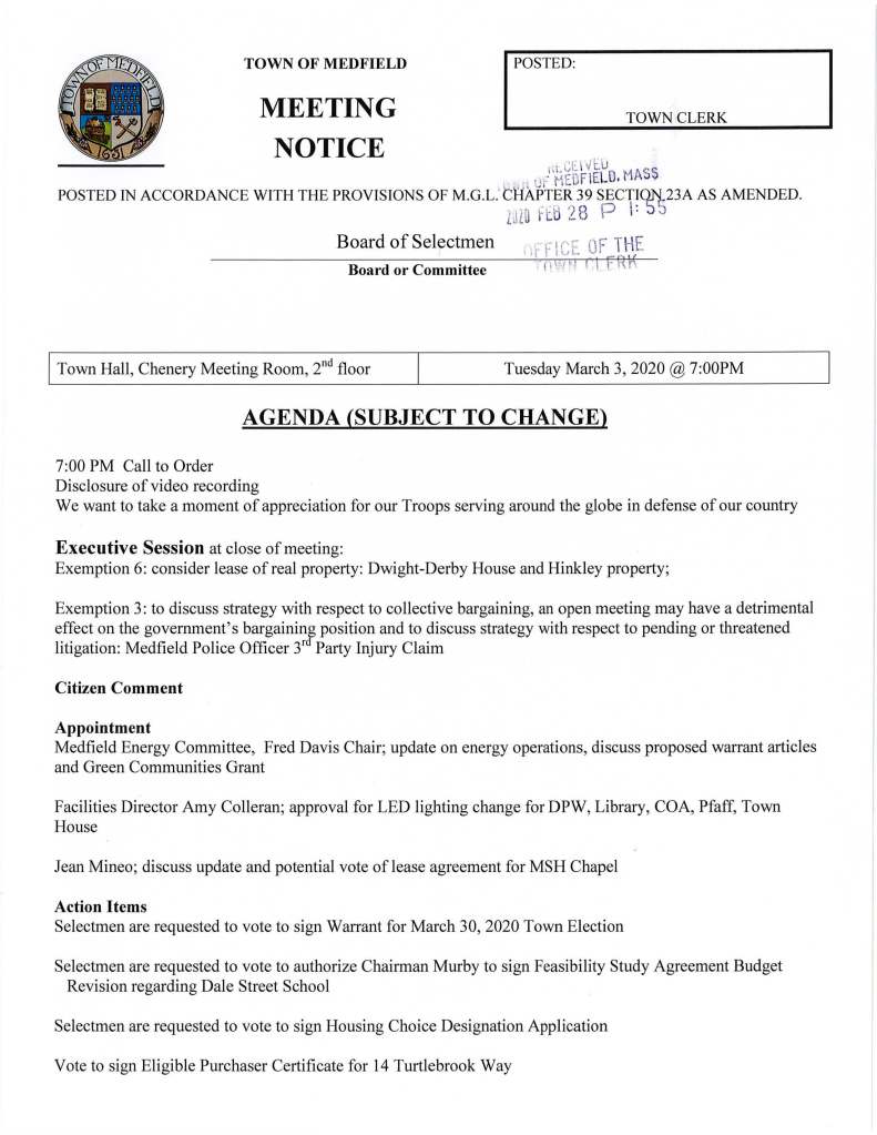 Executive Session at close of meeting: Exemption 6: consider lease of real property, Dwight-Derby House and Hinkley property; Exemption 3: to discuss strategy with respect to collective bargaining, an open meeting may have a detrimental effect on the government’s bargaining position.