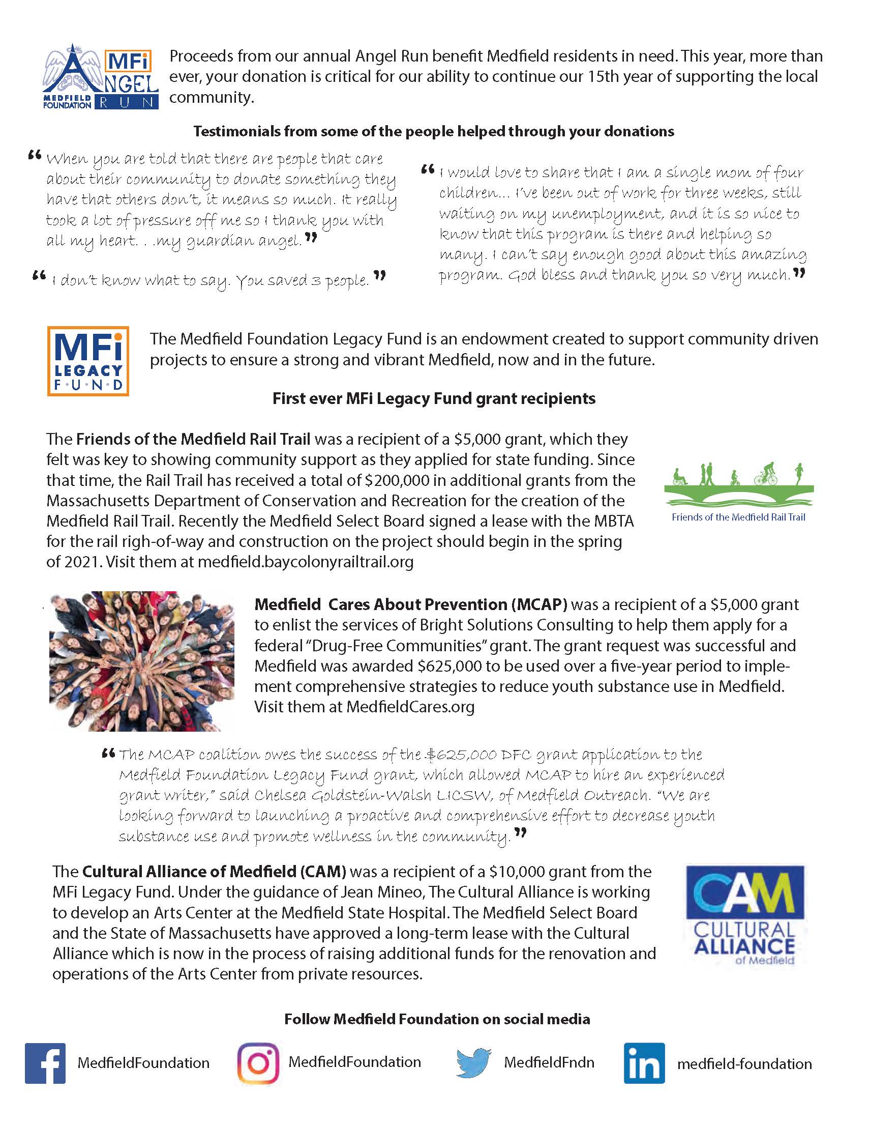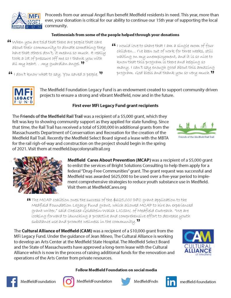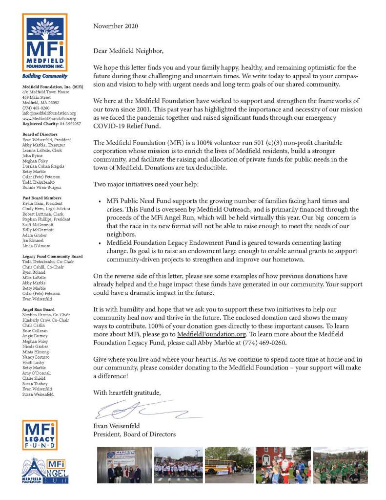 Below is the first ever Medfield Foundation annual appeal, that went to about 3,300 homes. If you want to donate for 2020, just date your check today, or contribute on-line at https://www.medfieldfoundation.org/give.