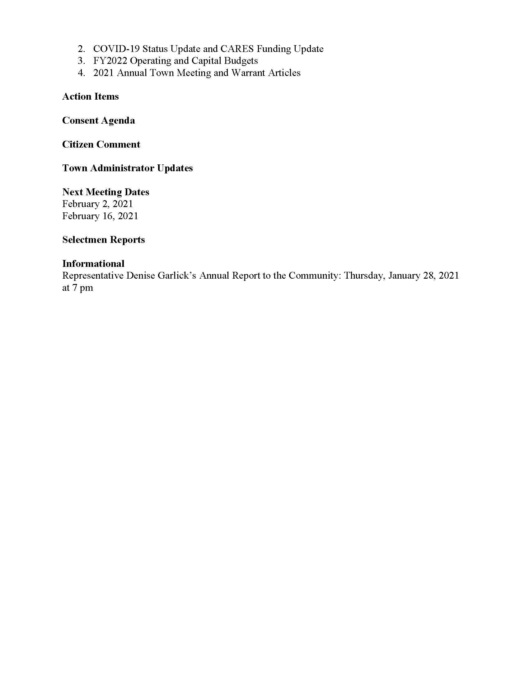 In light of the pandemic now taking over 400,000 American lives and sadly with the recent passing of Al Manganello lost to this virus, would the board consider adding a moment of silence for all who have succumbed to Covid-19 as well (at each meeting)? Appreciate your consideration of this suggestion.Best,Colleen508-359-5083sc3ms@verizon.net