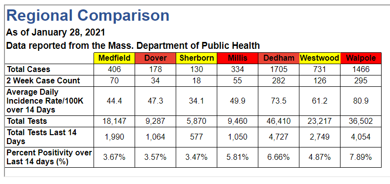 Medfield’s COVID-19 Data Dashboard has been updated with case and testing data as of 1/28/2021. Medfield remains in the yellow category and has a case count of 70 cases over the last 14 days.