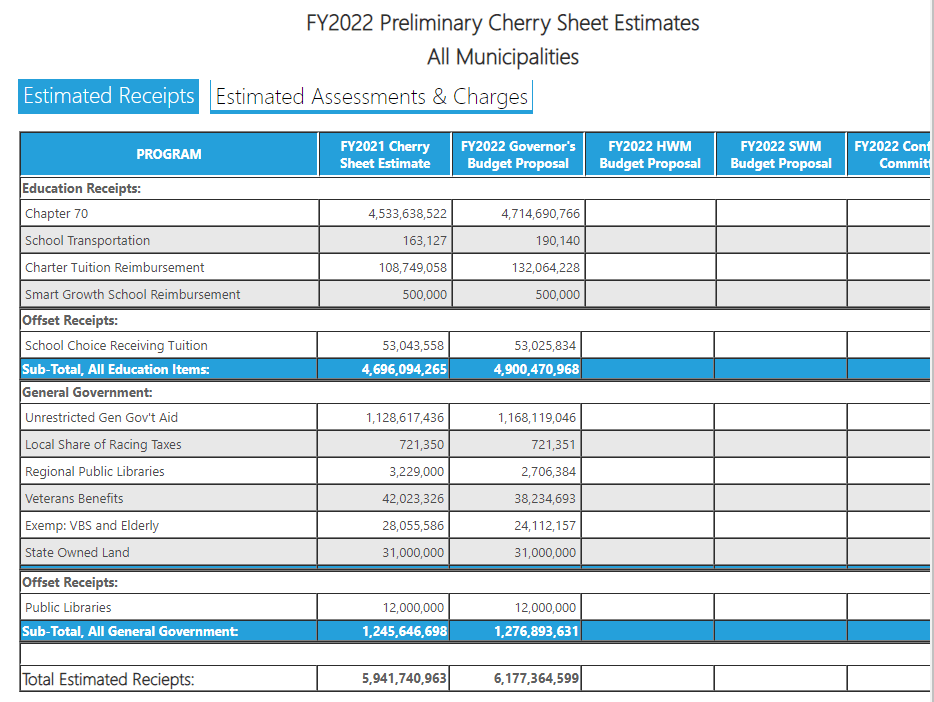 | HOUSE W&M COMMITTEE OFFERS $47.65B FY22 BUDGET WITH KEY INVESTMENTS IN MUNICIPAL & SCHOOL AID • INCLUDES THE FULL $39.5M INCREASE IN UGGA • INCREASES CHAPTER 70 BY $21M ABOVE GOV’S BUDGET TO FUND THE STUDENT OPPORTUNITY ACT ON SCHEDULE • INCREASES CHARTER SCHOOL REIMBURSEMENTS BY $37M • ADDS $55M FOR STUDENT ENROLLMENT AND SUMMER SCHOOL GRANTS • INCLUDES $367M TO FUND THE SPECIAL EDUCATION CIRCUIT BREAKER • RESTORES $6M TO LEVEL FUND REGIONAL SCHOOL TRANS. AT FY21 LEVEL • ADDS $1M TO McKINNEY-VENTO REIMBURSEMENTS OVER FY21 •ADDS $2M TO PILOT April 14, 2021 Dear Osler Peterson, Earlier today, the House Ways & Means Committee advanced a $47.65 billion fiscal 2022 state budget plan to the full House for consideration later this month. The plan would increase overall state expenditures by 2.6 percent over the current year’s budget, and reflects a 3.9 percent increase over the Governor’s January budget proposal. The HW&M budget matches the 3.5% increase in Unrestricted General Government Aid (UGGA) in the Gov’s budget, adds a significant increase to Chapter 70 school aid and Charter School reimbursements, and includes $55 million in important new grant programs. The full House will start debate on the FY22 budget on April 26, and House members must file all budget amendments by 5:00 p.m. on Friday, April 16. The House usually considers over 1000 amendments during budget debate week. H. 4000, the House Ways & Means budget, provides progress on many important local aid priorities, including the full $39.5 million increase in Unrestricted General Government Aid that the Governor proposed and communities are counting on. The House Ways & Means budget also mirrors the Governor’s proposed increase for Special Education Circuit Breaker, with an increase over FY 2021 of $22.5 million. The HW&M budget would increase funding for other major aid programs, by adding $21 million to Chapter 70 aid above the House One recommendation, for a total increase of $219 million; $37 million in additional funds for Charter School Mitigation payments, and an additional $1 million for McKinney-Vento transportation for homeless students. To acknowledge student enrollment declines due to the public health emergency, H. 4000 would set aside $40 million in a one-time reserve account to assist districts impacted by the decline, as well as $15 million in one-time grant funding for summer school and student mental health support. The proposal would also provide an increase of $1 million for public libraries and $1 million for regional public libraries. H. 4000 also proposes a $2 million increase for the Payment-in-Lieu of Taxes (PILOT) for state-owned land account. Later Today or By the End of the Week You Can Use this Link to See Your Community’s Local Aid and Preliminary Cherry Sheet Numbers in the House Ways & Means Budget, as Posted by the Division of Local Services You Can Link to the HW&M Committee’s Budget Here $39.5 MILLION INCREASE IN UNRESTRICTED MUNICIPAL AID In January, the Administration kept its commitment to cities and towns to tie the increase in Unrestricted General Government Aid to the projected rate of growth in state tax revenues. This year, that increase was 3.5%, representing an increase of $39.5 million. The House Ways and Means FY 2022 plan would provide $1.168 billion for UGGA, reflecting the same increase proposed by Governor Baker. In a statement released by the Chairs of the Joint Ways and Means Committee last week, the two chambers have reached an agreement on this amount and every city and town will see their UGGA funding increase by 3.5%. This is welcome news to provide stability and predictability in municipal budgeting. CHAPTER 70 AID RETURNS TO ORIGINAL STUDENT OPPORTUNITY ACT SCHEDULE The House budget committee is proposing a $219 million increase in Chapter 70 education aid ($21 million higher than the $197.7 million increase in H. 1), which would fund the “goal rates” originally set forth in the Student Opportunity Act. The SOA schedule set a 7-year schedule beginning in FY 2021, but that was sidelined last year due to the public health emergency. To get back on track, the MMA joined with other education advocates to ask the Legislature to fund Chapter 70 at an SOA implementation rate of 1/6th rather than 1/7th in order to return to the intended schedule. Last week, House and Senate leaders reached a local aid funding agreement, which included this commitment to fund the increases in the SOA at 1/6th, funding Chapter 70 at a total of $5.503 billion. While this is important progress for districts, most districts remain at minimum aid. CHARTER SCHOOL MITIGATION PAYMENTS WOULD INCREASE BY $37 MILLION House Ways & Means is proposing a total of $154 million for Charter School Mitigation Payments, which reflects an increase of $37 million over the current fiscal year. In keeping with the first year of a 3-year phase-in funding schedule outlined in the Student Opportunity Act, this investment meets the Legislature’s statutory obligation to fund charter school reimbursements at 75%. Charter school finance still presents a major challenge to many districts, in a number of cases negating the increases districts realize in Chapter 70 aid. $367 MILLION FOR SPECIAL EDUCATION CIRCUIT BREAKER In line with the Governor’s budget recommendation in January, the House Ways & Means Committee’s budget includes the Governor’s recommendation of $367 million for Special Education Circuit Breaker, a $22.5 million increase over FY 2021. The Student Opportunity Act expanded the circuit breaker by including out-of-district transportation, an important enhancement for cities and towns. HW&M PROVIDES MIXED FUNDING FOR SCHOOL TRANSPORTATION ACCOUNTS The House Ways & Means budget level funds regional transportation at $82 million. The budget would increase transportation for homeless students under McKinney-Vento by $1million to $14.4 million. There is no line item for out-of-