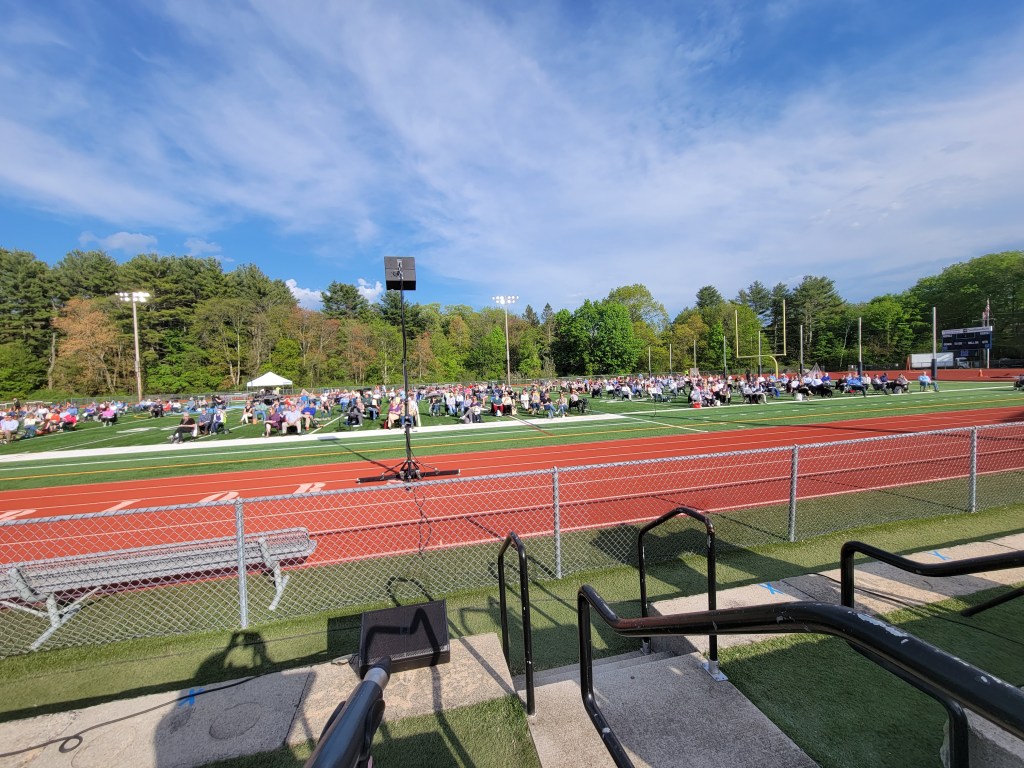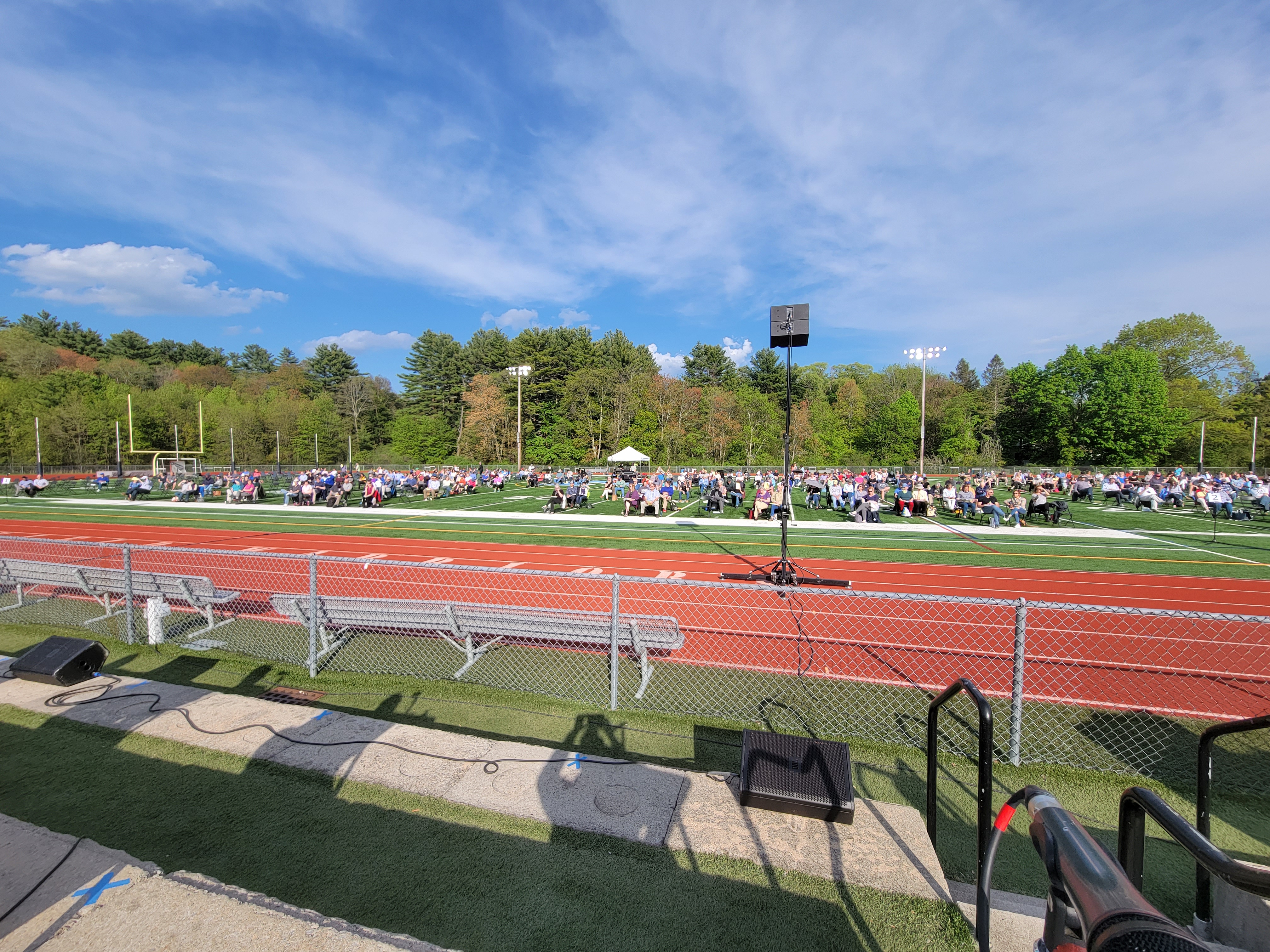 Below is the view of the 450 town residents from the platform at the front of the ATM across the front of the bleachers – note Select Board photographer’s shadow to understand how residents had to look right into the setting sun. There were two great video screens at the front to either side of the front platform, just like at a concert, that were rented to assist viewing the speakers – they were the best addition to the ATM. We experienced typical New England weather, storm clouds with rain drops to start, then sunny and too hot, and at the end 63 degrees that felt like freezing after an hour of sitting still in it. Fortunately, at the very end at around 9PM, after four hours, the Moderator asked if anyone was still undecided on the last Article about siting the new school (only a very few hands appeared), and then he called the question. About a dozen people waiting at microphones then lost their opportunity to speak.