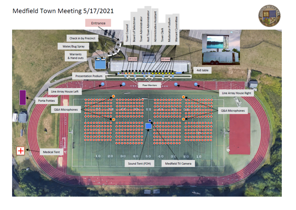 This has been updated from last year. The most noticeable change is we will have two entrances to town meeting with check in by precinct to expedite entrance to the meeting. We will also have two large video screens behind/above the bleachers for the presentations.