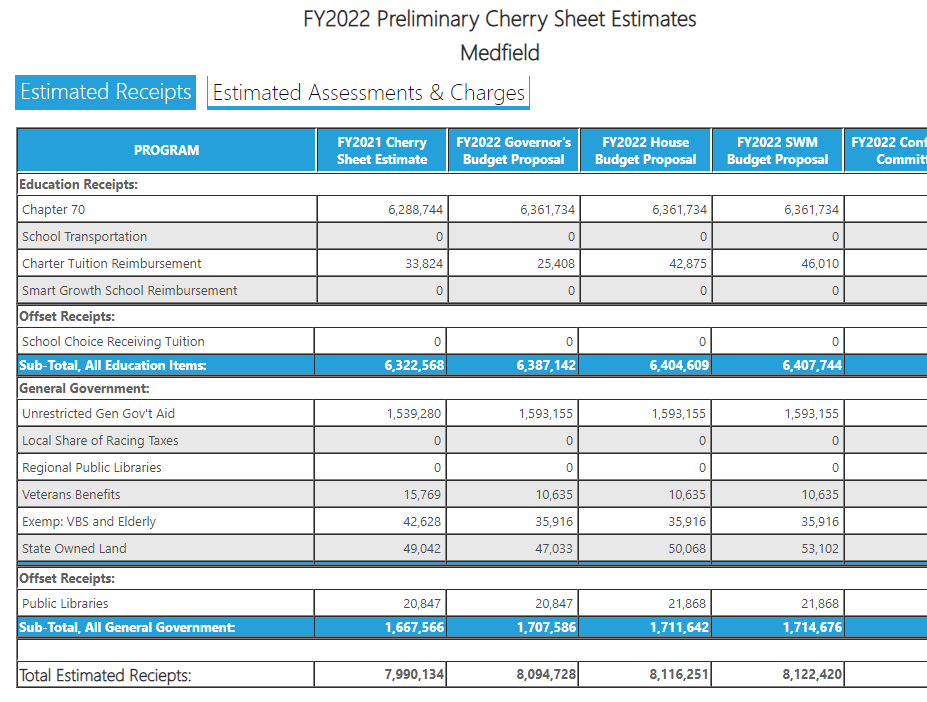These state aide estimates are from the Division of Local Services (DLS) at the Massachusetts Department of Revenue. Next a conference committee has to reconcile the different amounts proposed by the legislature and the senate. –