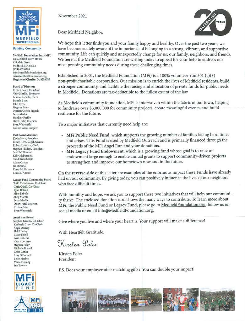 Twenty years ago as a newly elected select board member I was uncertain when the schools, under Superintendent Bob Maguire, announced that the town needed to renovate three schools at a cost of $56m. I knew nothing about building schools or any other municipal buildings, so I attended about two dozen meetings over the course of the next year, held by the then School Building Committee under the leadership of its Chair, Tim Bonfatti. That resulted in my learning a lot and ultimately supporting the town renovating the Memorial School, the Medfield High School and the Blake Middle School.