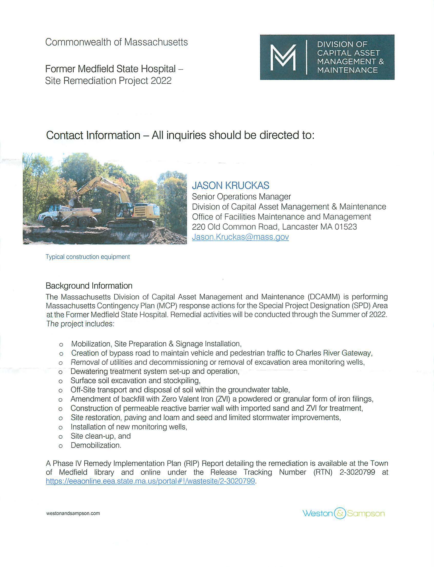 Below is the DCAMM flyer from the fence at the Medfield State Hospital Overlook, retrieved during last evening’s walk. Currently there is a huge hole dug out at the site of the VOC (perc I think) plume (the formerly laundry building site) between the mural and the Overlook, and a huge pile of those soils in the adjoining field. This is the website DCAMM lists for more information.