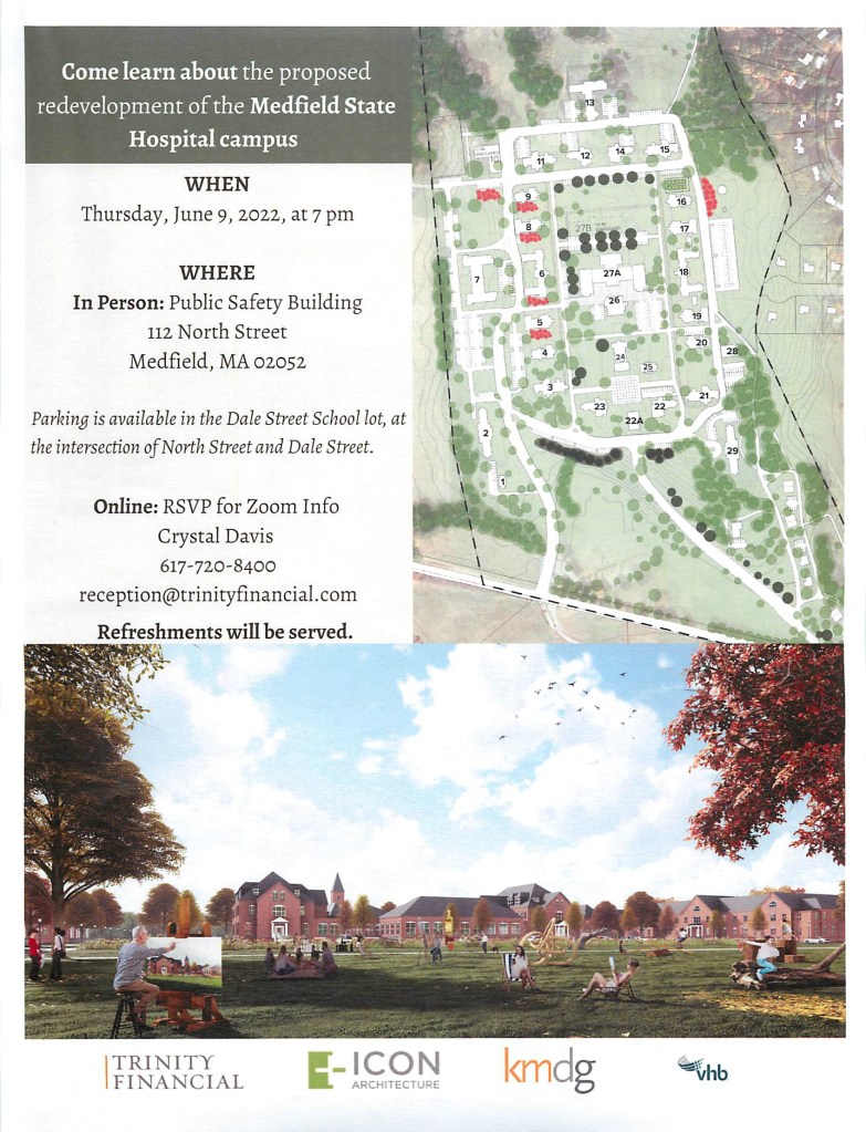 Trinity’s flyer in today’s Hometown Weekly appears below. The special town meeting (STM) to vote on the proposed deal with Trinity has been scheduled for June 21. The Land Disposition Agreement setting forth the details of the proposed deal should be made public soon – Select Board meeting in executive session at 4PM this afternoon about that LDA.