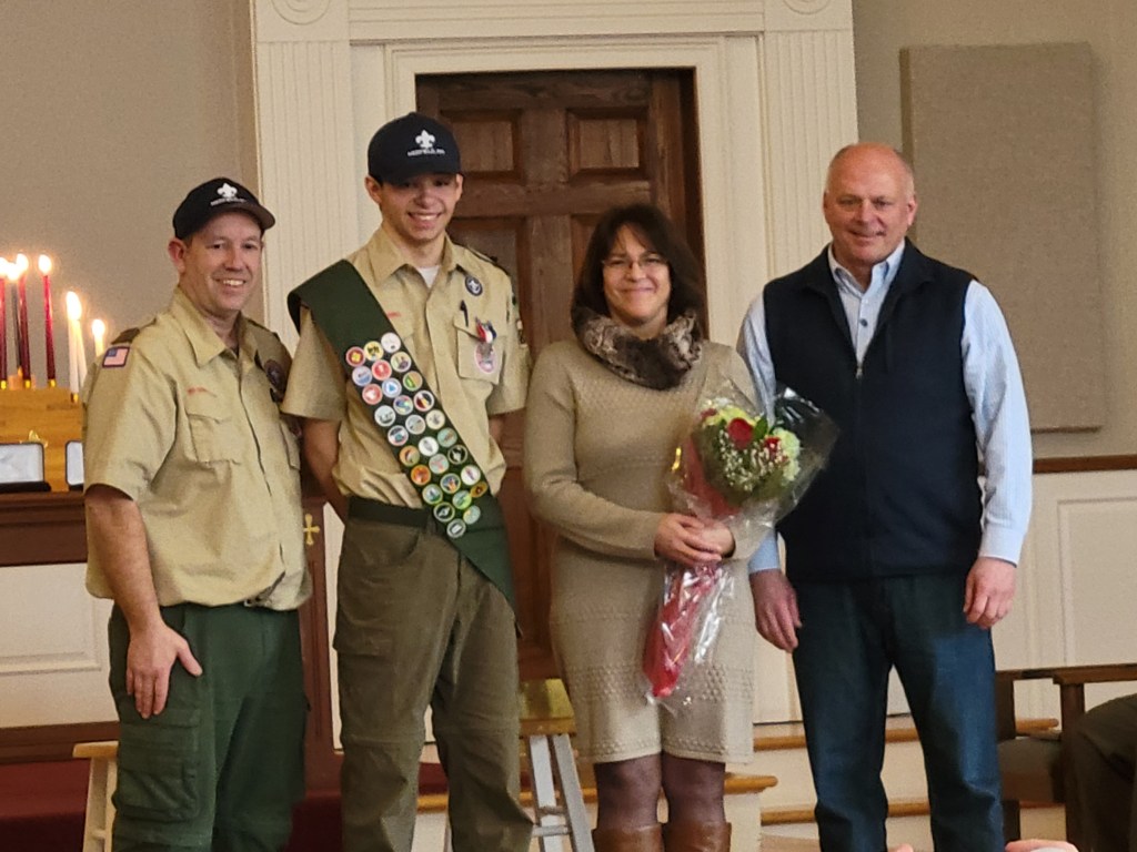 L-R: Scoutmaster Jim Hatch, Dylan, Fran and Terry Corbett