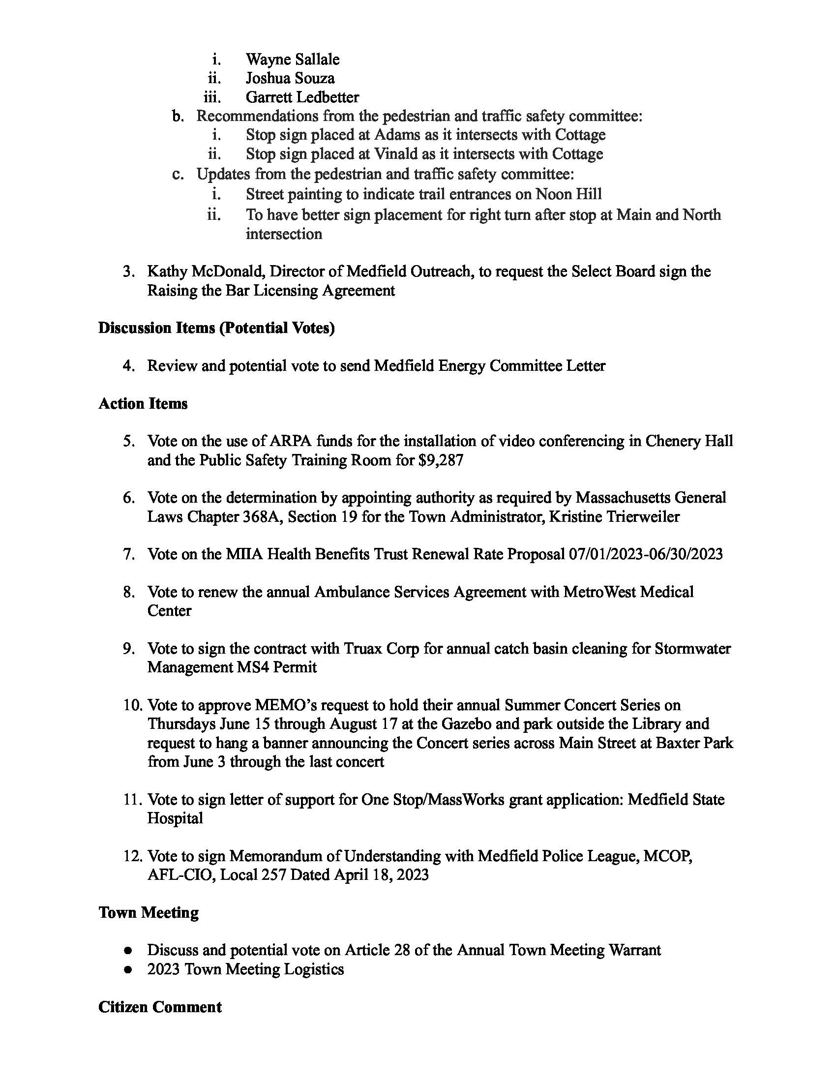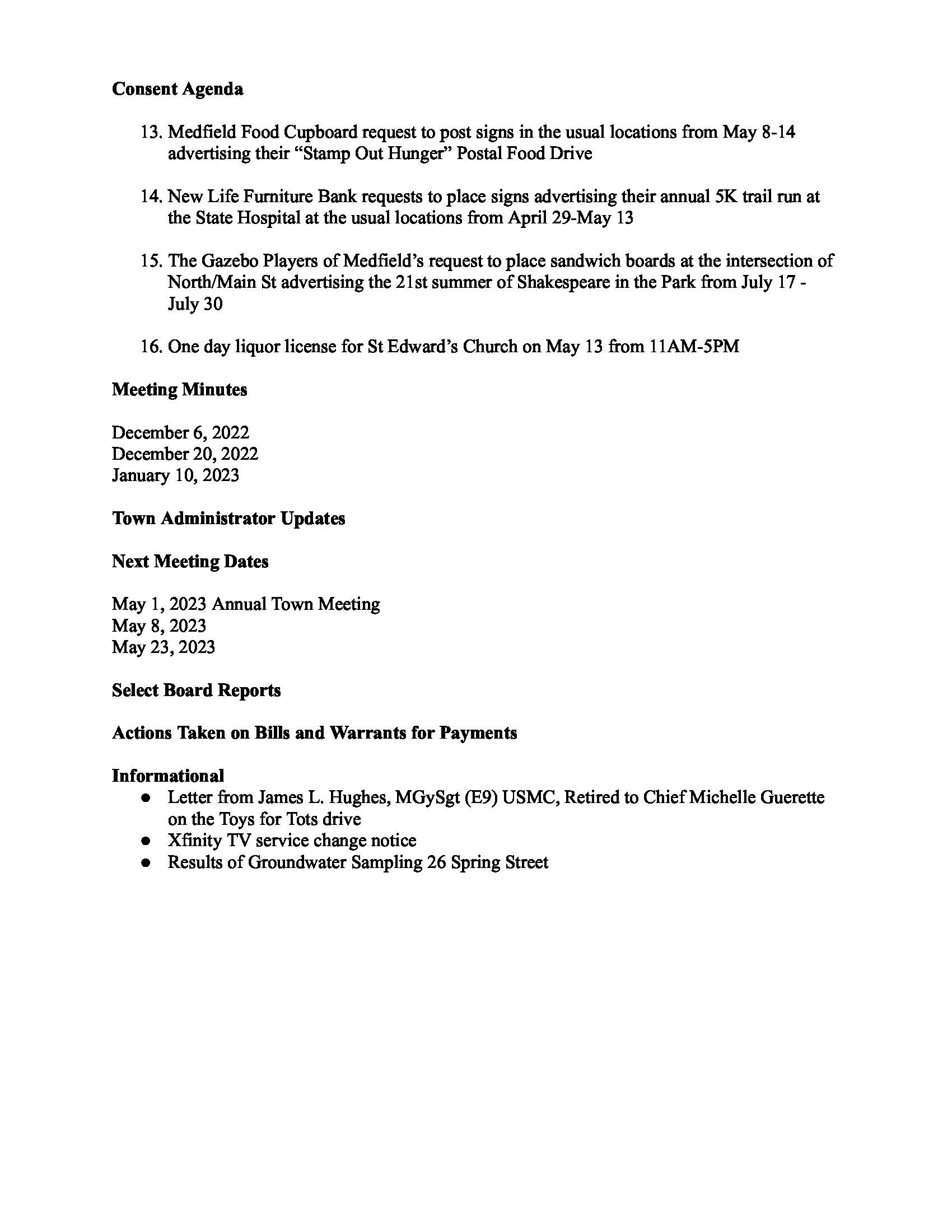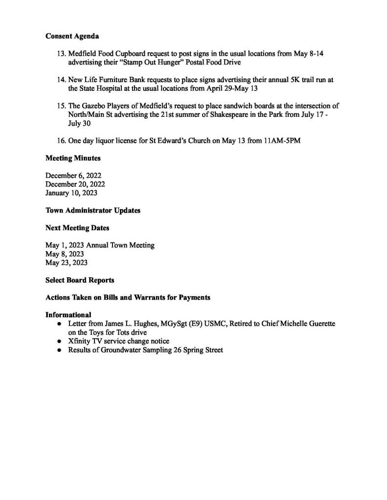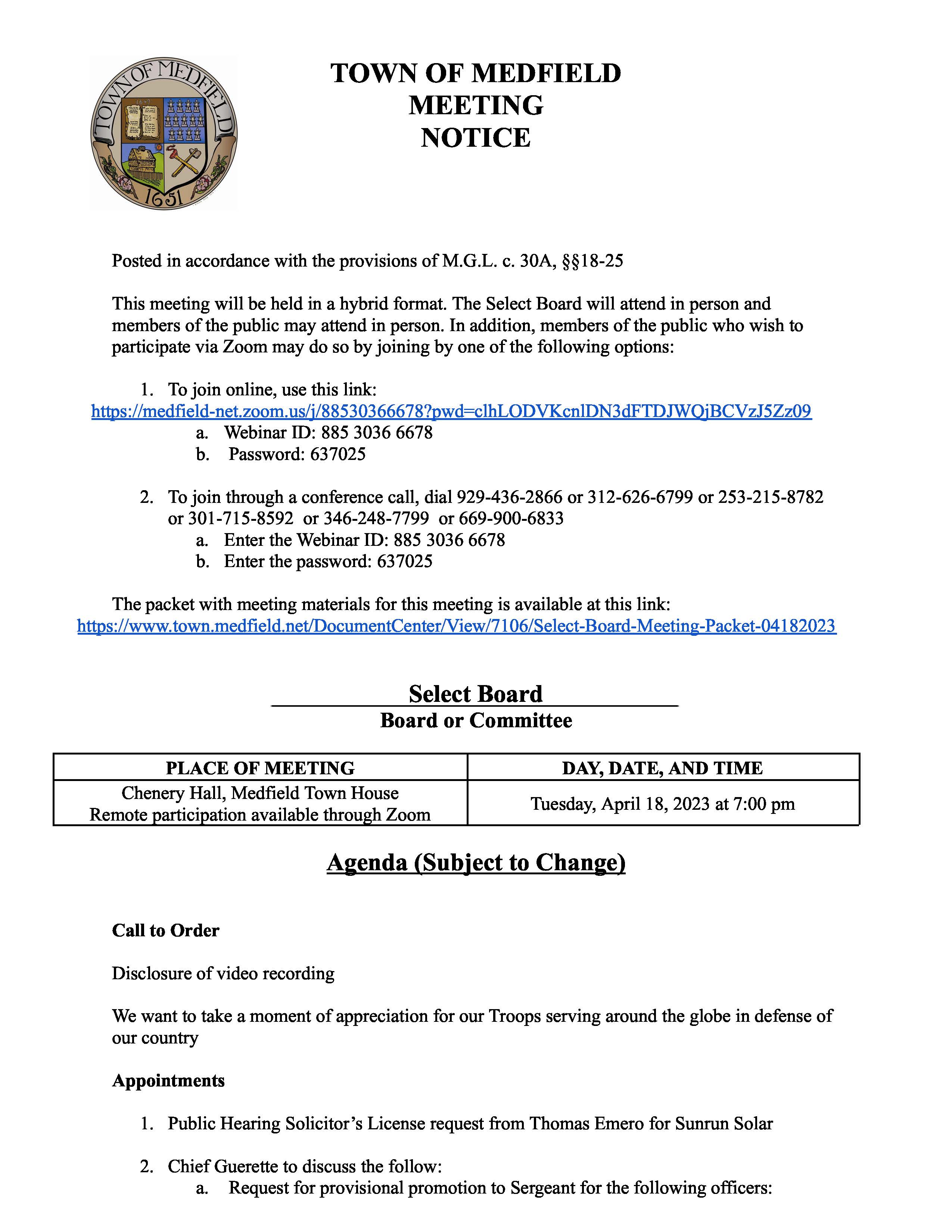 The packet with meeting materials for this meeting is available at this link: https://www.town.medfield.net/DocumentCenter/View/7106/Select-Board-Meeting-Packet-04182023