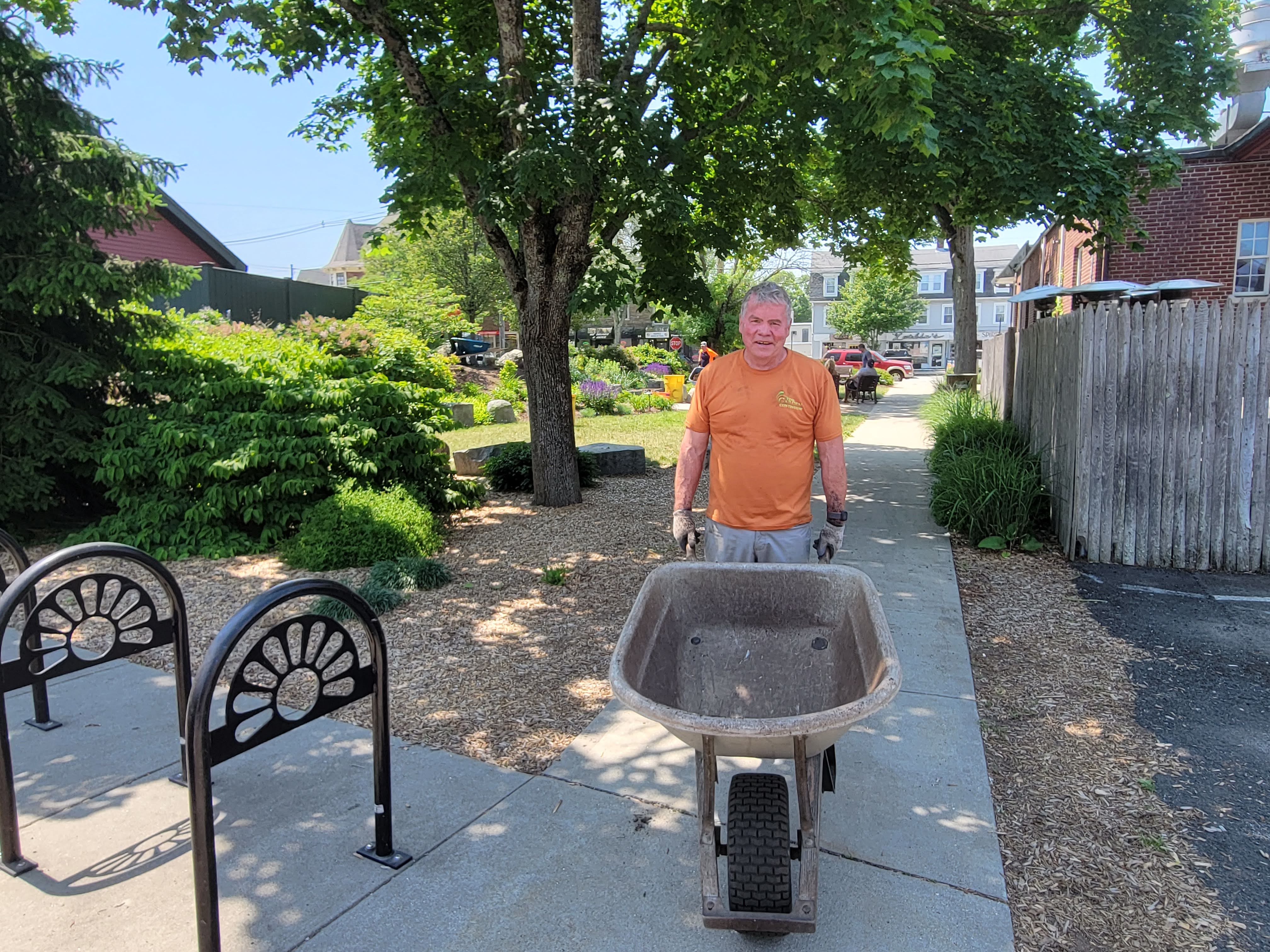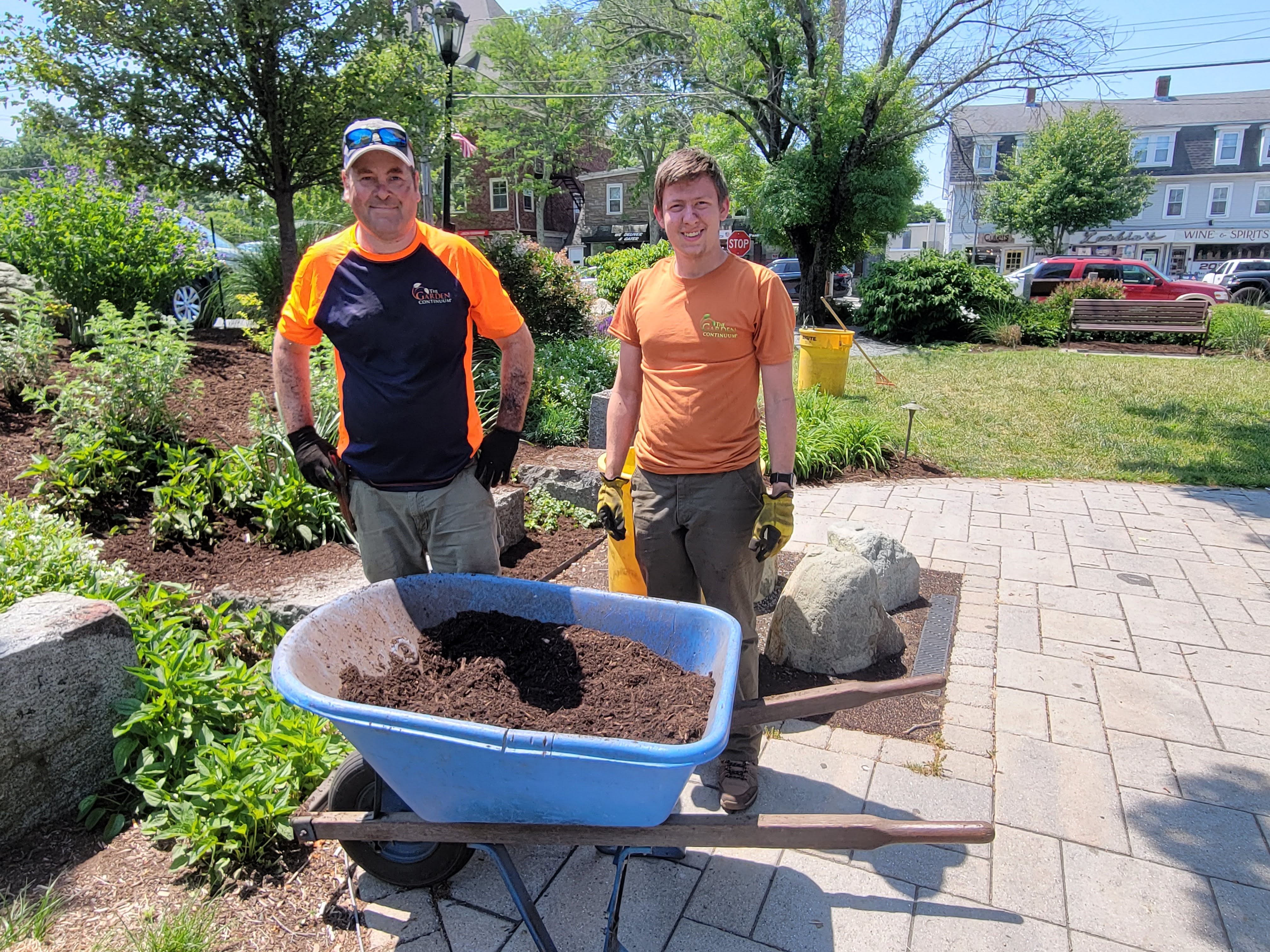 Monique Allen and her landscaping business, The Garden Continuum, volunteered lots of time to design and plant the Straw Hat Park. They made the Straw Hat Park a reality, and now today The Garden Continuum was back comping their time to spread mulch.