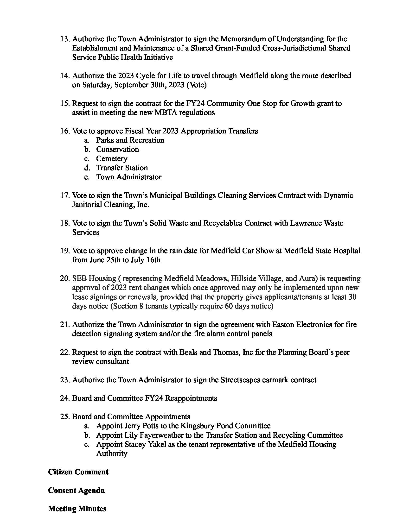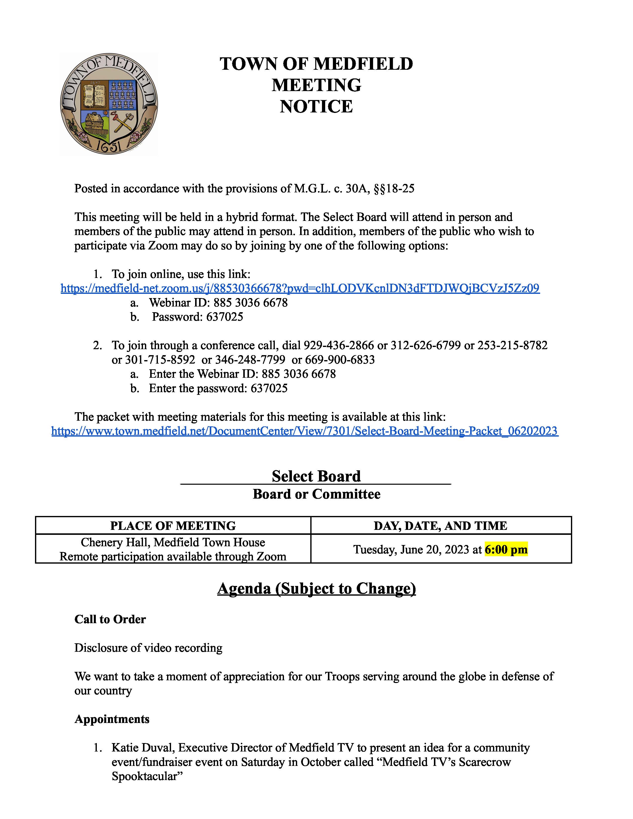 The packet with meeting materials for this meeting is available at this link: https://www.town.medfield.net/DocumentCenter/View/7301/Select-Board-Meeting-Packet_06202023