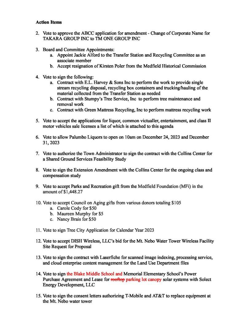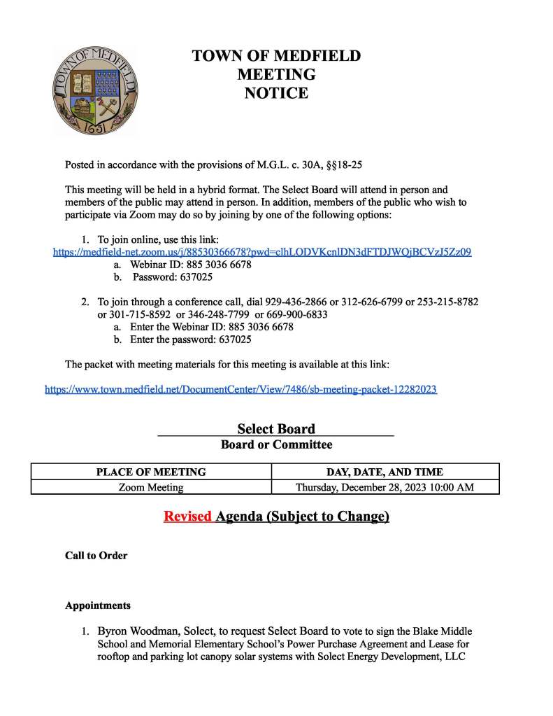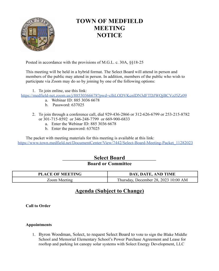 The Select Board meets this morning at 10AM to vote to sign the solar photovoltaic PPA agreements with Solect Energy for both a Memorial parking lot canopy and a Blake Middle School rooftop. The PPA’s need to be signed before year end to qualify for better financial returns.
