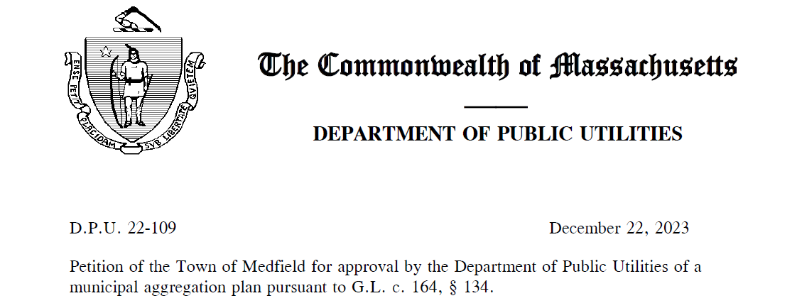 Good morning – I’d like to alert you to an Order issued by the Department of Public Utilities today in the Town of Medfield’s municipal aggregation plan. Please see attached.