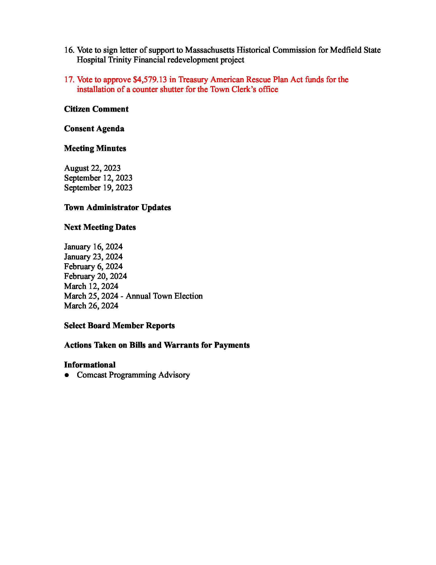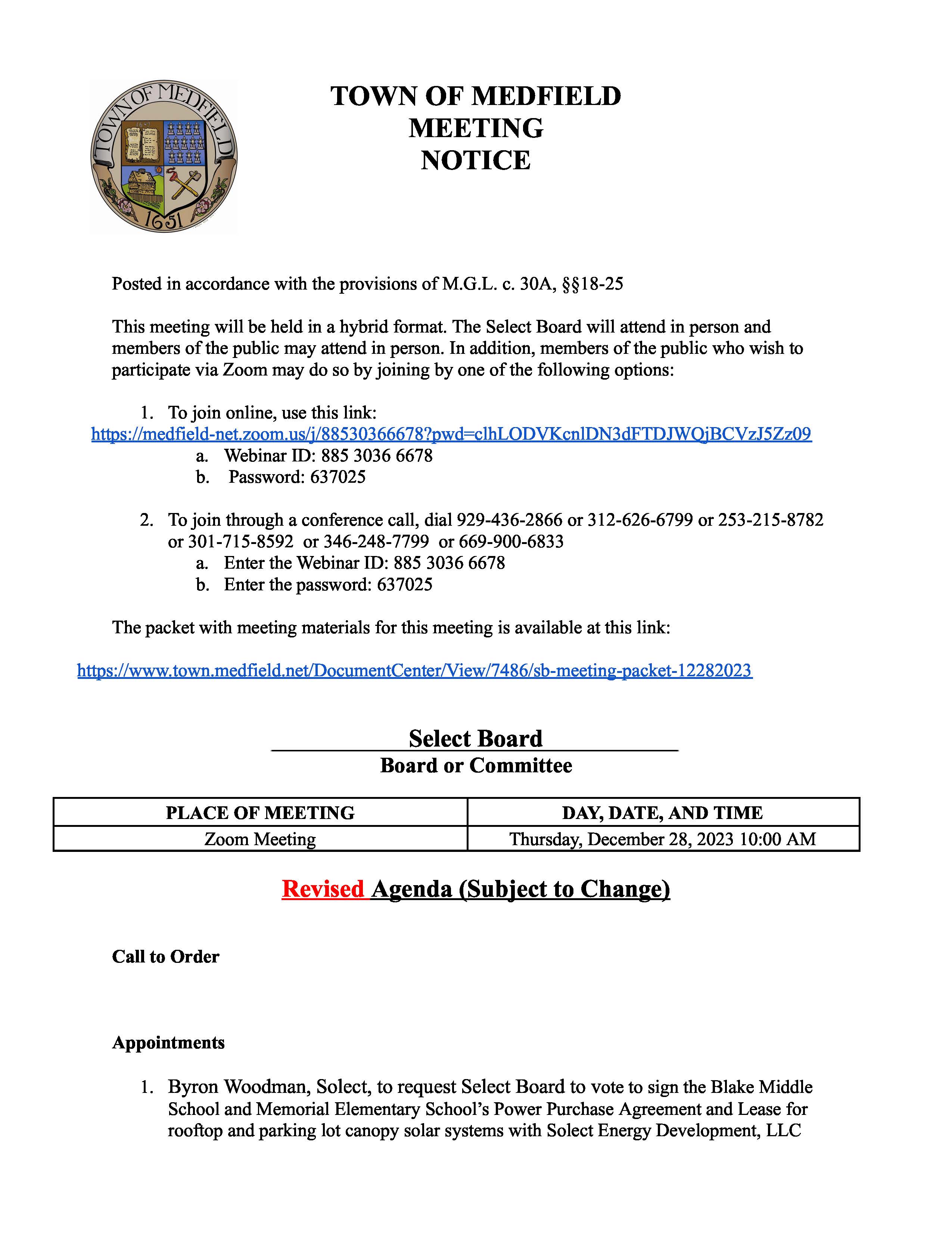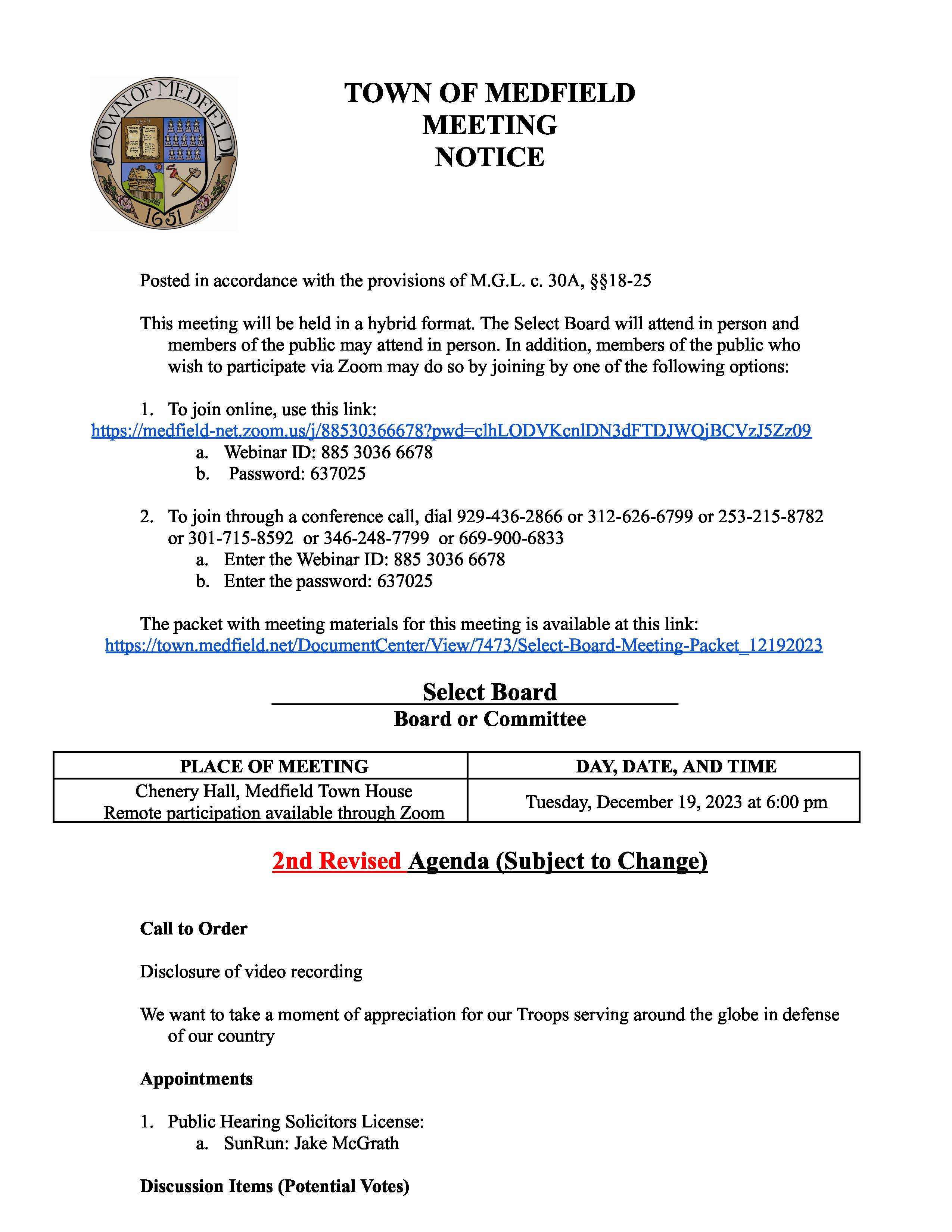 To join through a conference call, dial 929-436-2866 or 312-626-6799 or 253-215-8782 or 301-715-8592 or 346-248-7799 or 669-900-6833 a. Enter the Webinar ID: 885 3036 6678 b. Enter the password: 637025 The packet with meeting materials for this meeting is available at this link: https://www.town.medfield.net/DocumentCenter/View/7442/Select-Board-Meeting-Packet_11282023