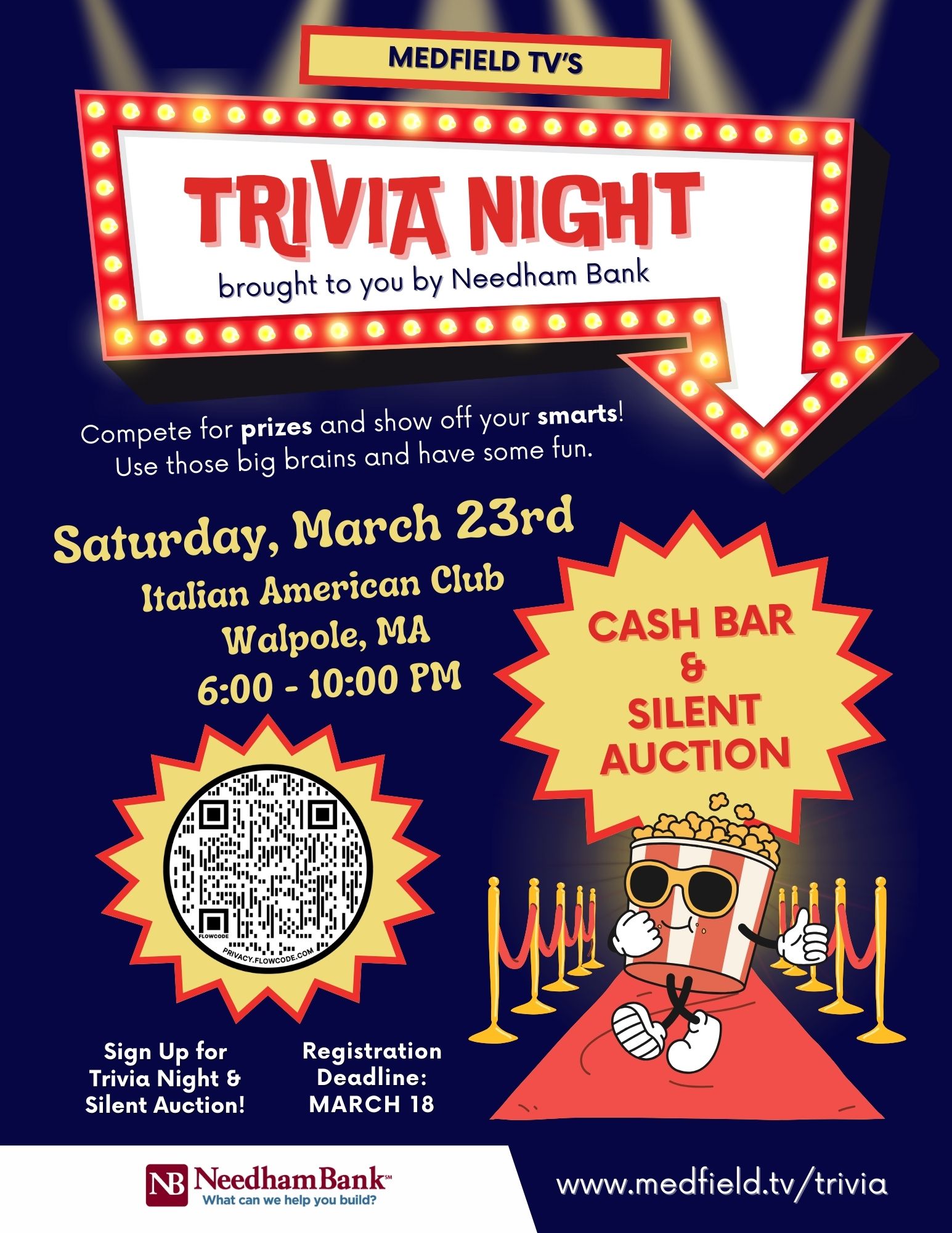 Medfield TV’s first annual Trivia Night, brought to you by Needham Bank is on Saturday, March 23rd from 6-10pm at the Italian American Club in Walpole. It will be a lively and intellectually charged evening. The theme of the night is “Movies”, and classic theater snacks will be provided. There will also be a cash bar and silent auction for luxurious trips. This fundraiser will not only test participants’ knowledge but also contribute to Medfield TV’s mission to provide media access and education to all residents. So grab a few friends, put on your thinking caps and join the fun! Register at www.medfield.tv/trivia.