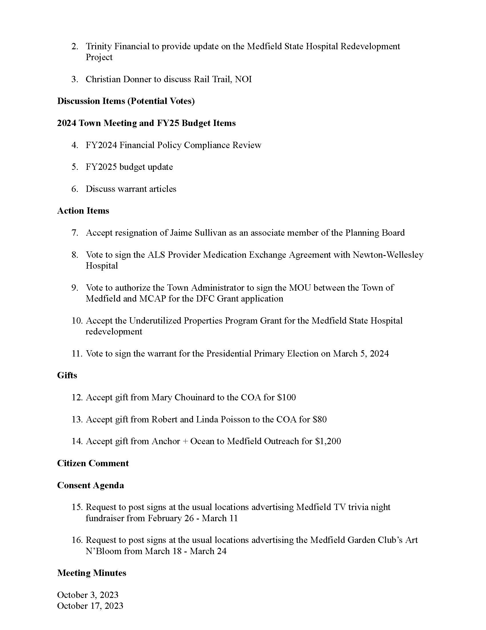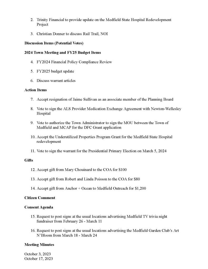 To join through a conference call, dial 929-436-2866 or 312-626-6799 or 253-215-8782 or 301-715-8592 or 346-248-7799 or 669-900-6833 a. Enter the Webinar ID: 885 3036 6678 b. Enter the password: 637025 The packet with meeting materials for this meeting is available at this link: https://www.town.medfield.net/DocumentCenter/View/7659/Select-Board-Meeting-Packet_02062024