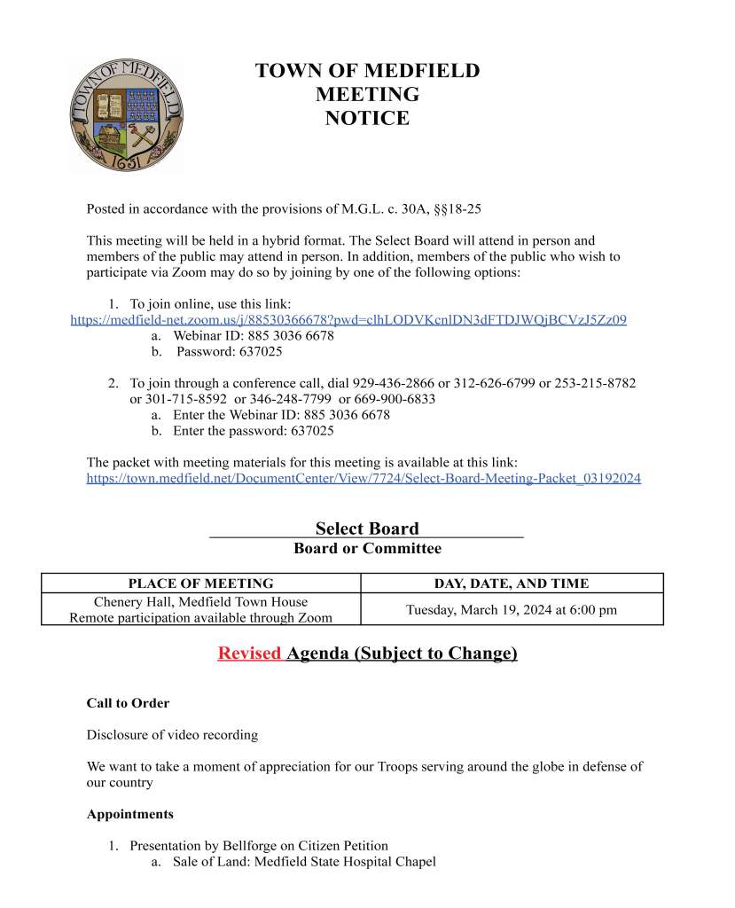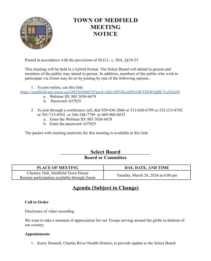 To join through a conference call, dial 929-436-2866 or 312-626-6799 or 253-215-8782 or 301-715-8592 or 346-248-7799 or 669-900-6833 a. Enter the Webinar ID: 885 3036 6678 b. Enter the password: 637025 The packet with meeting materials for this meeting is available at this link: https://town.medfield.net/DocumentCenter/View/7724/Select-Board-Meeting-Packet_03192024