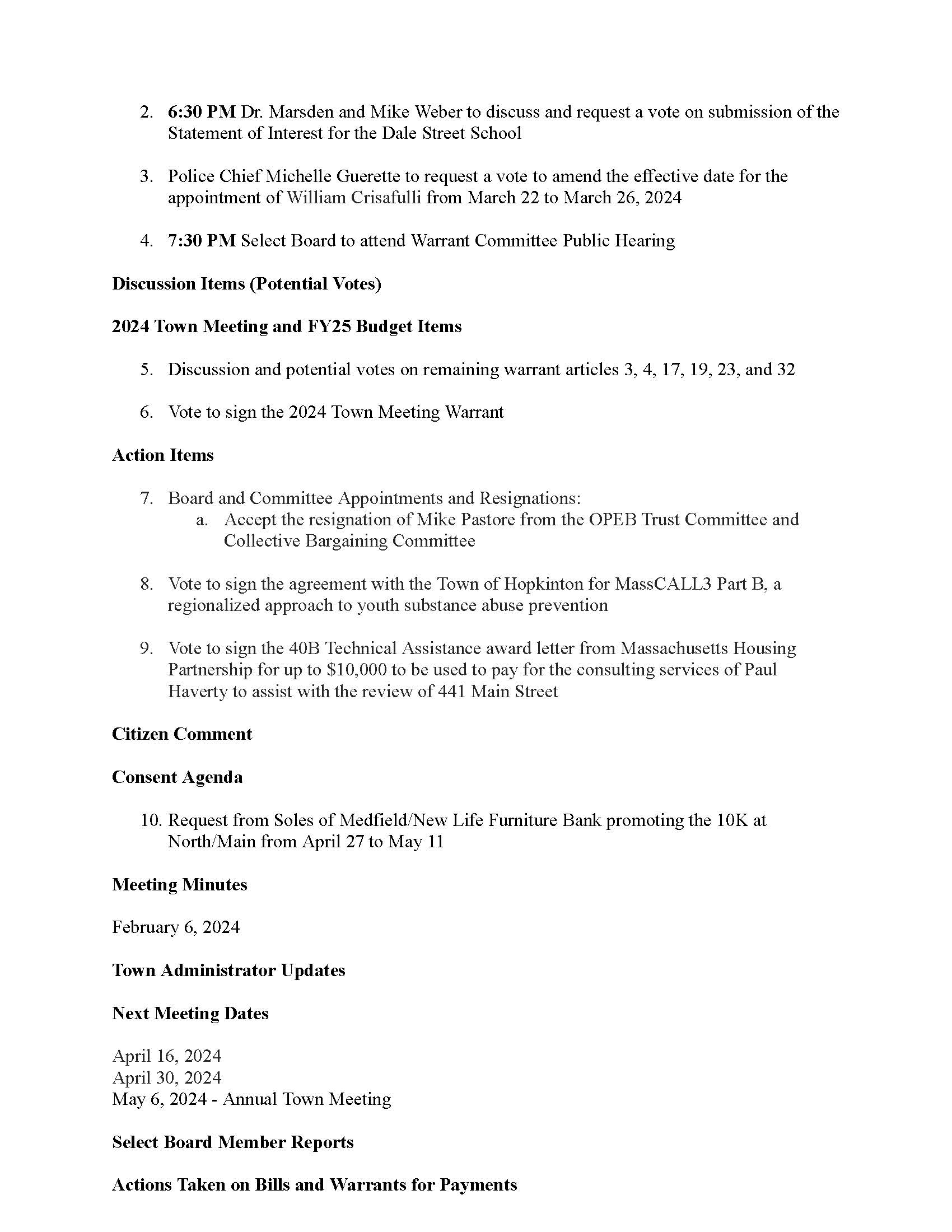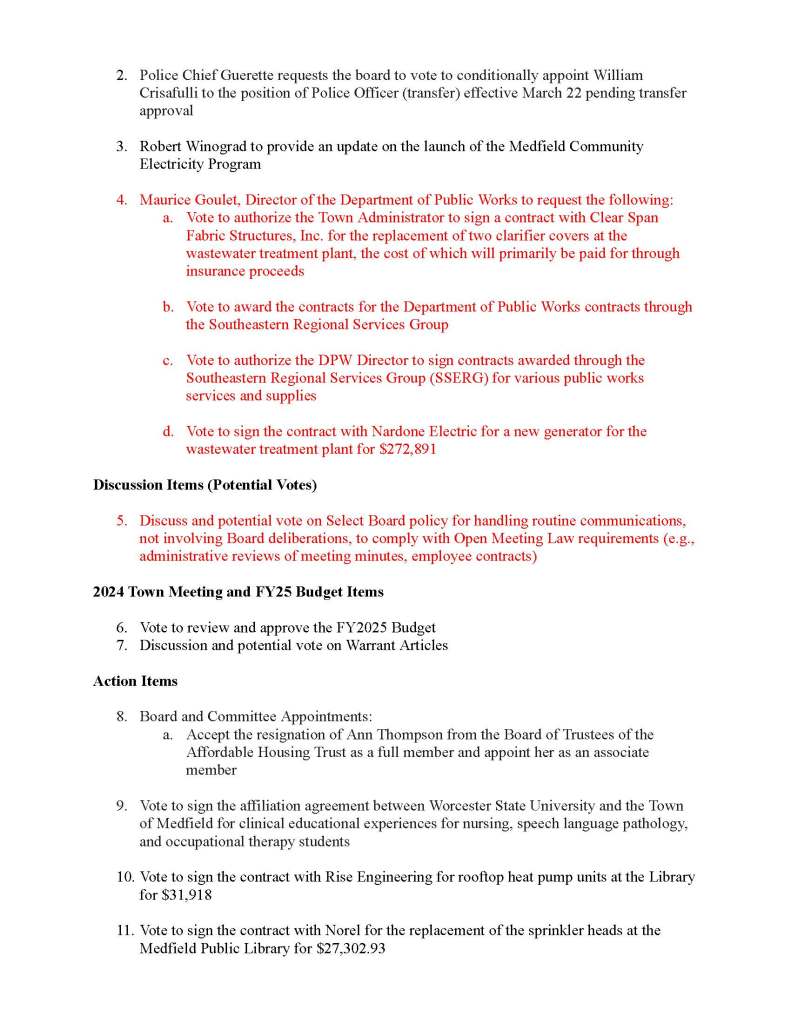 To join through a conference call, dial 929-436-2866 or 312-626-6799 or 253-215-8782 or 301-715-8592 or 346-248-7799 or 669-900-6833 a. Enter the Webinar ID: 885 3036 6678 b. Enter the password: 637025 The packet with meeting materials for this meeting is available at this link: https://www.town.medfield.net/DocumentCenter/View/7785/Select-Board-Meeting-Packet_04022024