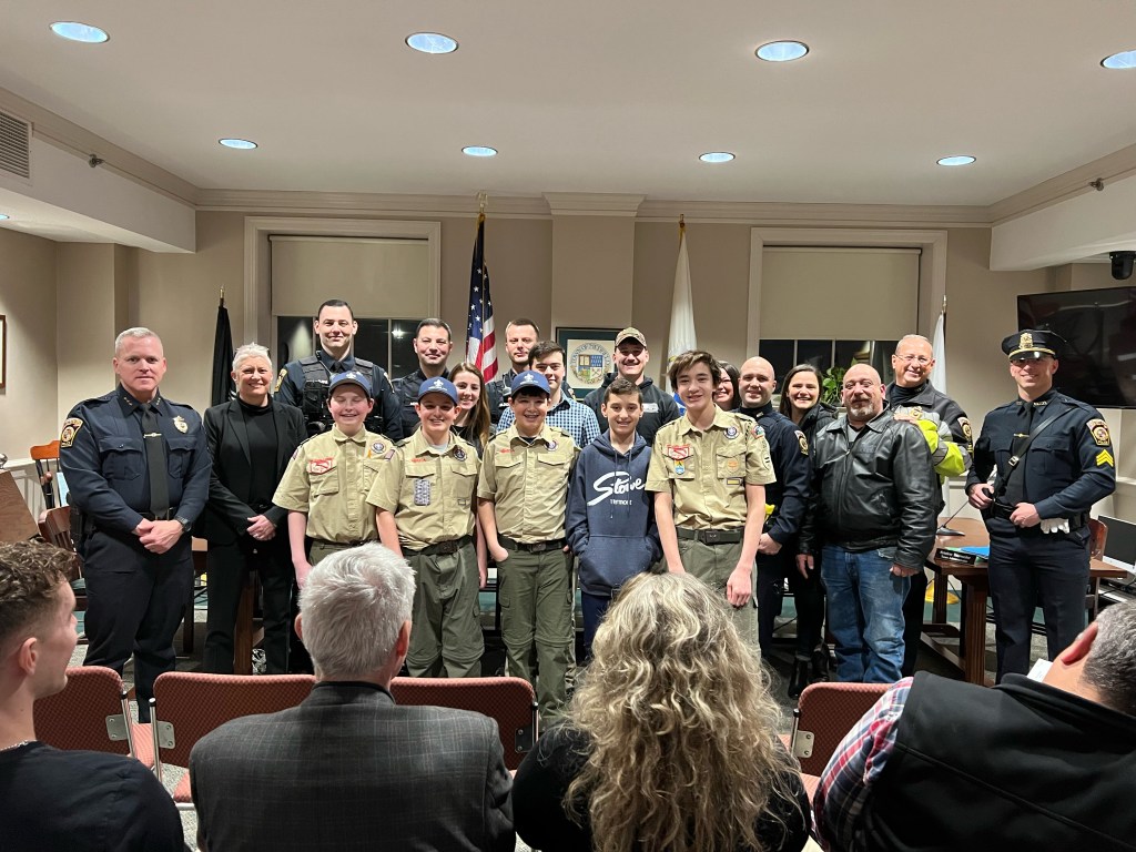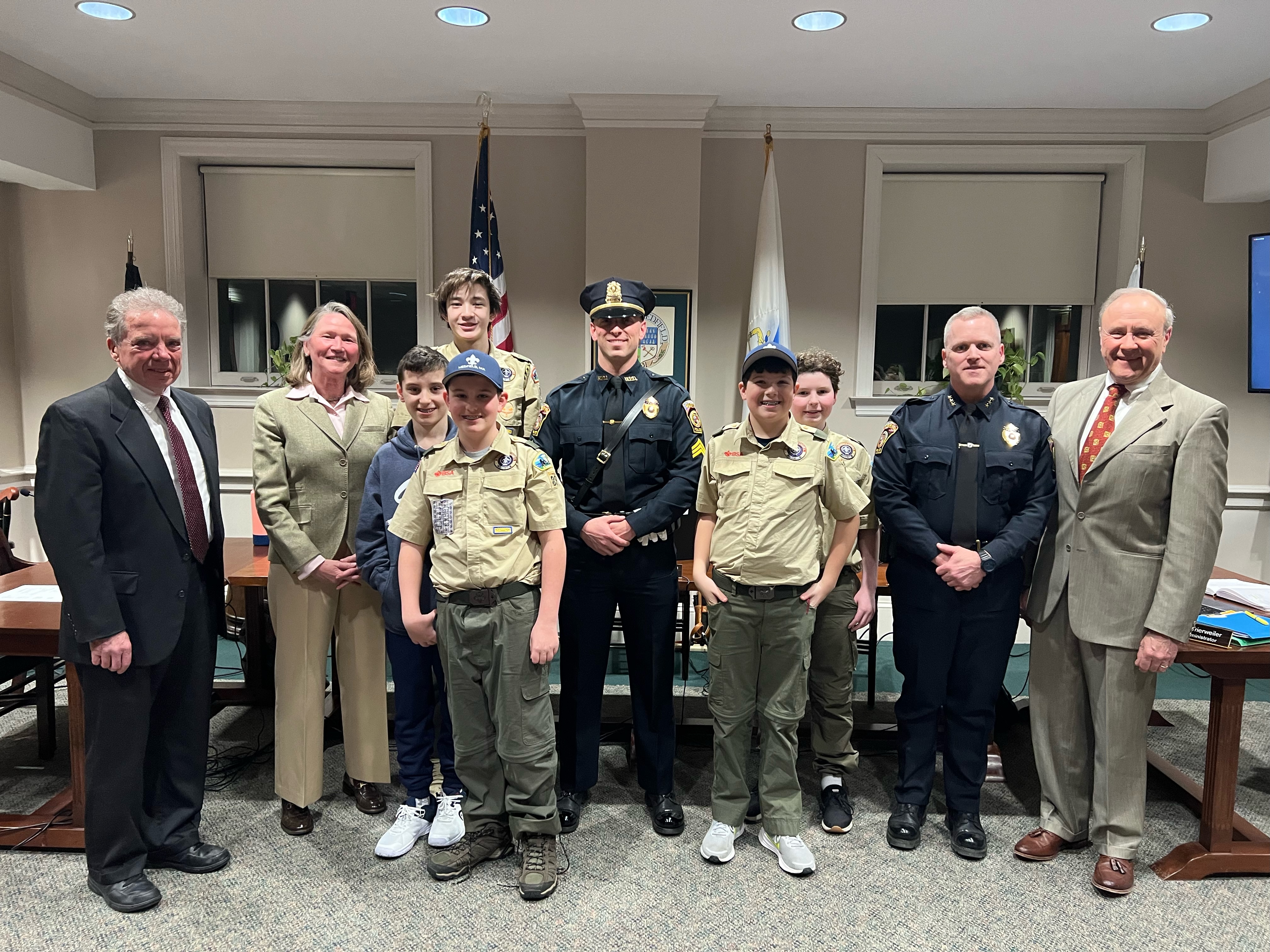 There were lots of uniforms in the room: police, scouts, and the Select Board members in their suits uniforms.