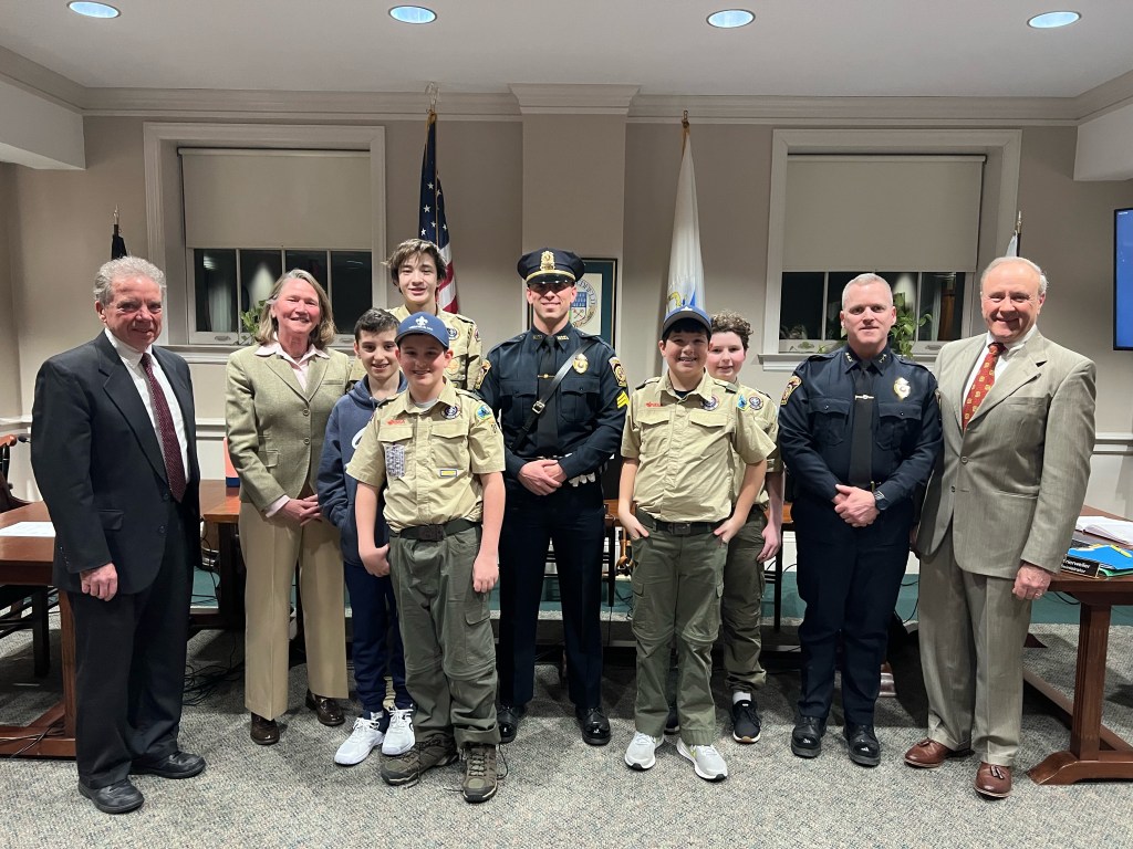 The Promotion of Francis Thisse to Sergeant was celebrated by the Medfield Police and Troop 89 Boy Scouts at the Select Board Meeting