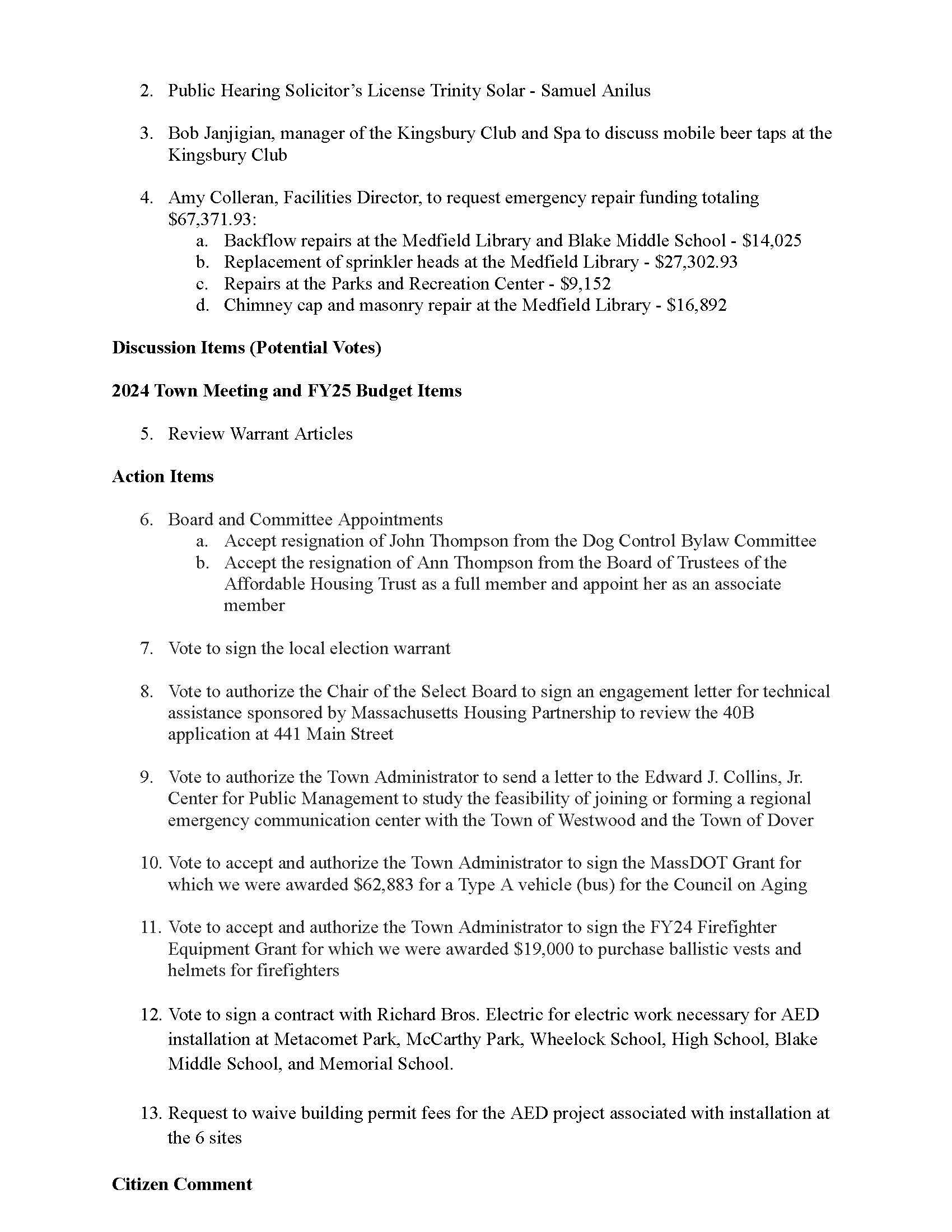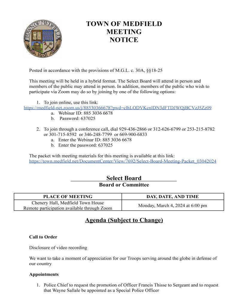 To join through a conference call, dial 929-436-2866 or 312-626-6799 or 253-215-8782 or 301-715-8592 or 346-248-7799 or 669-900-6833 a. Enter the Webinar ID: 885 3036 6678 b. Enter the password: 637025 The packet with meeting materials for this meeting is available at this link: https://town.medfield.net/DocumentCenter/View/7692/Select-Board-Meeting-Packet_03042024