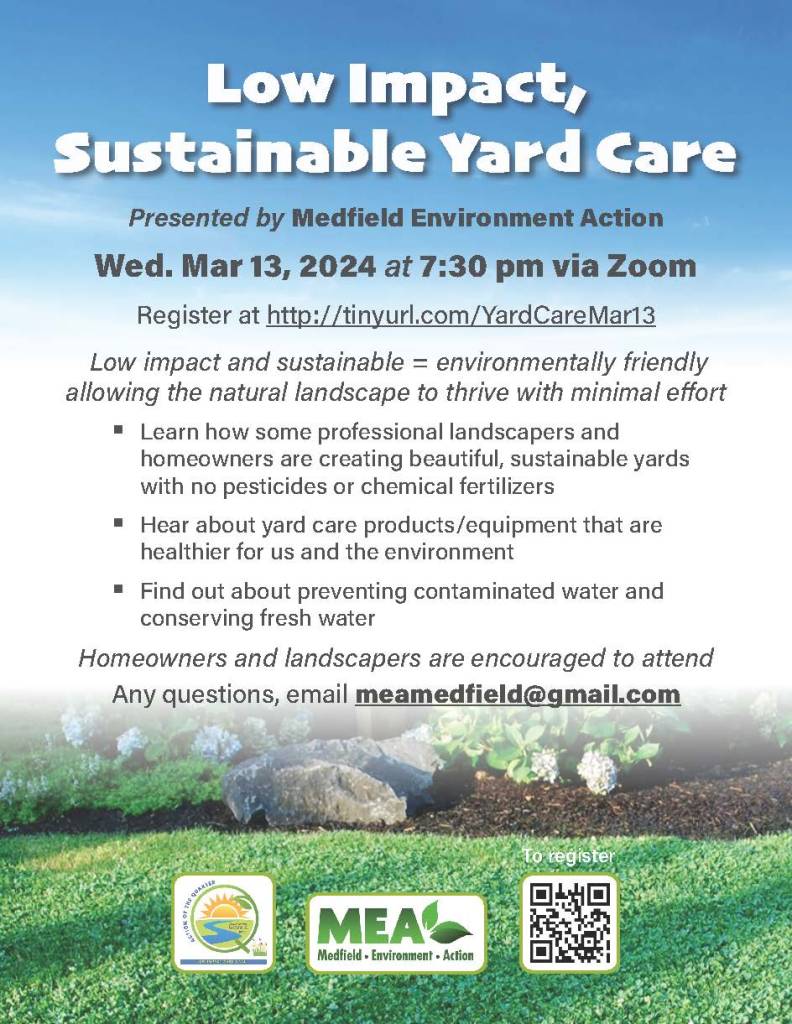Homeowners and landscapers are invited to attend a webinar on Wed. Mar 13 at 7:30 pm on Low Impact, Sustainable Yard Care. Included will be presentations on pesticide and chemical free native gardens, use of earth- friendly lawn equipment and information on equipment that is harmful to humans and the earth. In addition, representatives from the Charles River Watershed Association will speak about how to prevent contaminating water and how to conserve fresh water. Other presenters include Monique Allen, The Garden Continuum in Medfield, George Carrette, Ecoquiet Lawn Care in Concord and Tricia Glass from Quiet Communities. Jeff Hyman, Medfield homeowner, will walk us through how he has transformed his yard into a clean, sustainable and welcoming yard and he will explain how Medfielders can do it in their own yards.
