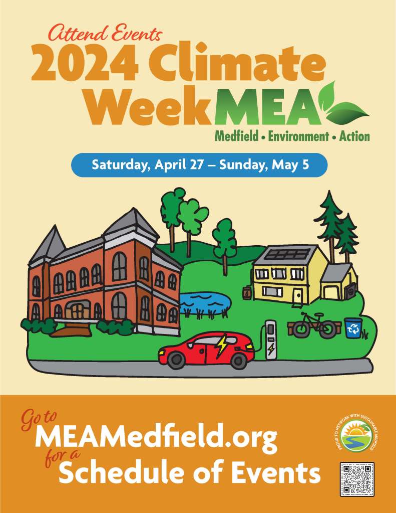 MEA is excited to announce Medfield’s second annual Climate Week from Saturday, April 27th – Sunday, May 5th. A variety of unique events are taking place throughout the week at various locations around town. The goal is to have fun, spread awareness, educate, and network with neighbors. Any questions please email meamedfield@gmail.com.