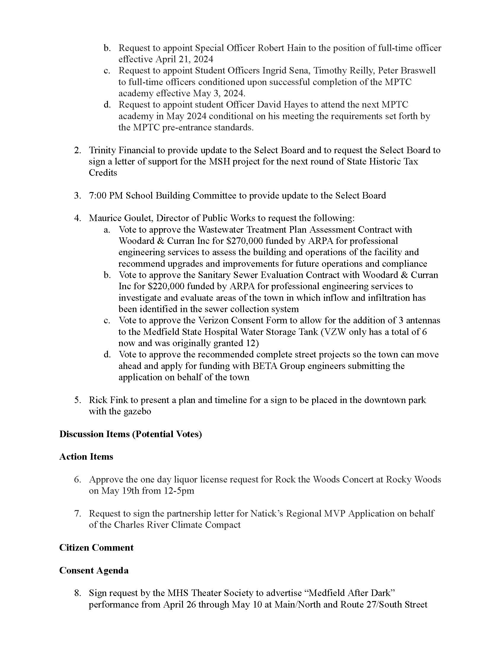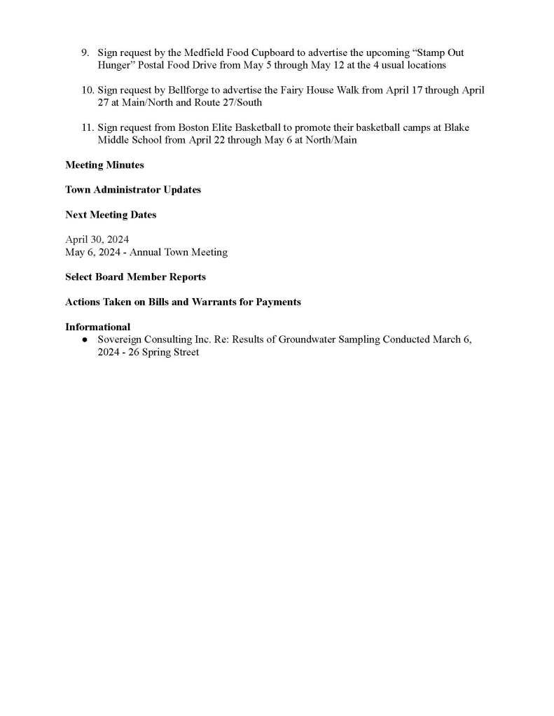 To join through a conference call, dial 929-436-2866 or 312-626-6799 or 253-215-8782 or 301-715-8592 or 346-248-7799 or 669-900-6833 a. Enter the Webinar ID: 885 3036 6678 b. Enter the password: 637025 The packet with meeting materials for this meeting is available at this link: https://www.town.medfield.net/DocumentCenter/View/7802/Select-Board-Meeting-Packet_04162024