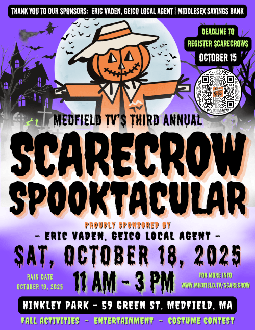 Time to boo-gie! Gourd vibes are coming to Hinkley Park on Saturday, October 18th from 11:00 AM to 3:00 PM when Medfield TV’s 3rd Annual Scarecrow Spooktacular festival returns! This event won’t cost you an arm or a leg. It’s free and is open to all ages. There’s something for every boil and ghoul to see!