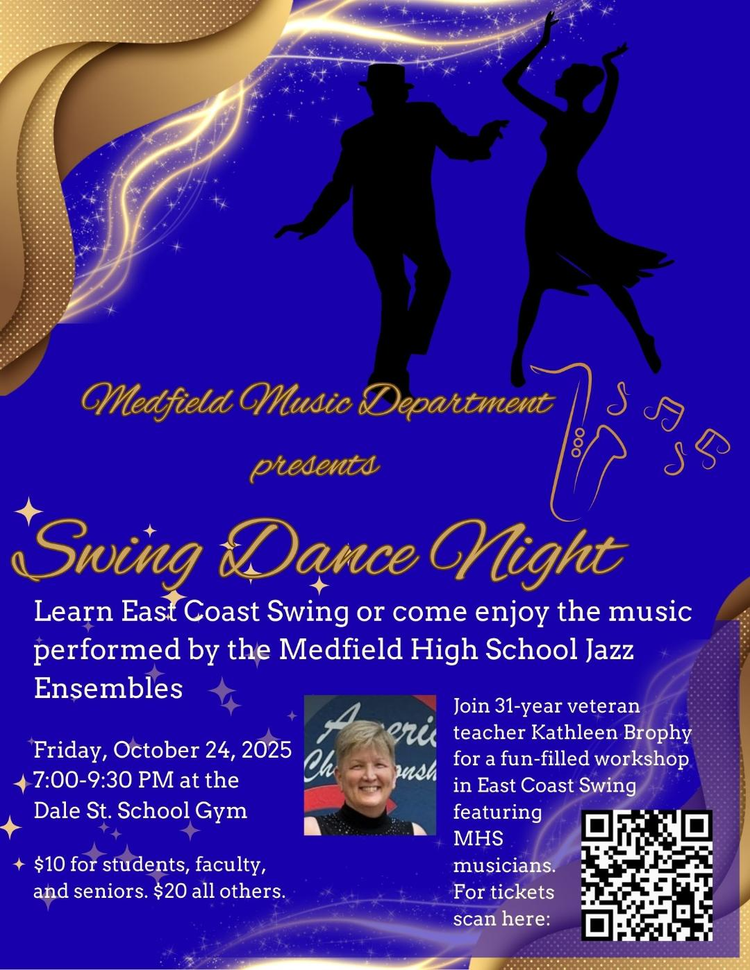 Kathy Brophy is our new instructor who will be teaching East Coast Swing dancing! It’s much easier than Lindy Hop to learn and can be danced to just about any genre – country, jazz, R&B, etc… The award winning High School Jazz Ensemble and Soundwaves will serve as our “house band” and will be performing throughout the night.