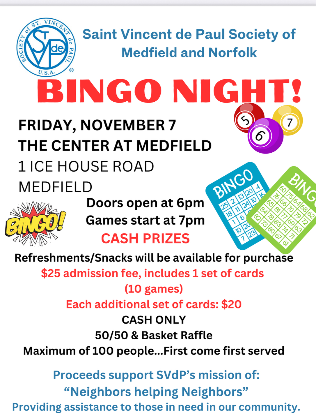 The St. Vincent de Paul Society (SVdP) of Medfield & Norfolk will host a Bingo Night Fundraiser on Friday, November 7, at The Center at Medfield, 1 Ice House Rd. Doors open at 6pm and games begin at 7pm.