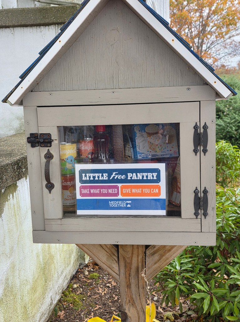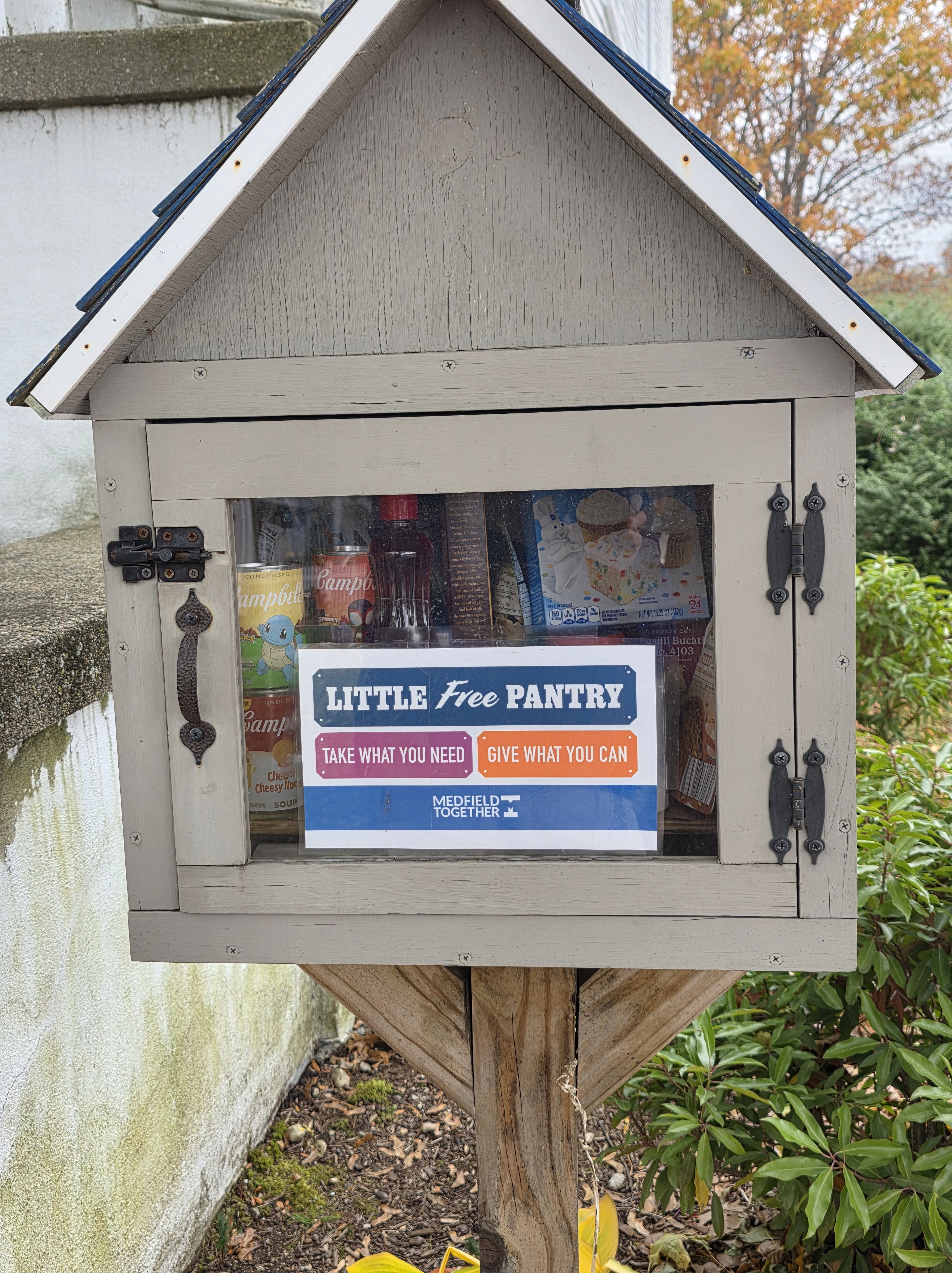 I saw the food in this little library today next to the UU First Parish Meeting House when I walked to buy my bread for lunch at Brothers Marketplace. Sad to see our country with the need for this, and glad for Medfield Together, apparently, responding locally. If people in town need food please also contact the Medfield Food Cupboard.