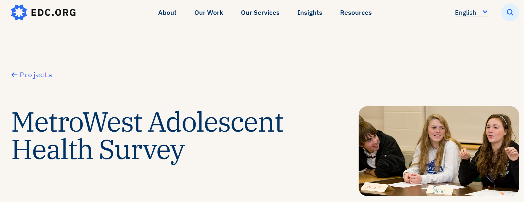 The Medfield Public Schools has participated in the MetroWest Adolescent Health Survey since 2006. This survey is administered every two years to more than 40,000 students in grades 6–12 across 25 school districts in the MetroWest region of Massachusetts. Parents are provided the opportunity to review the survey in advance and may opt their child out if they choose.