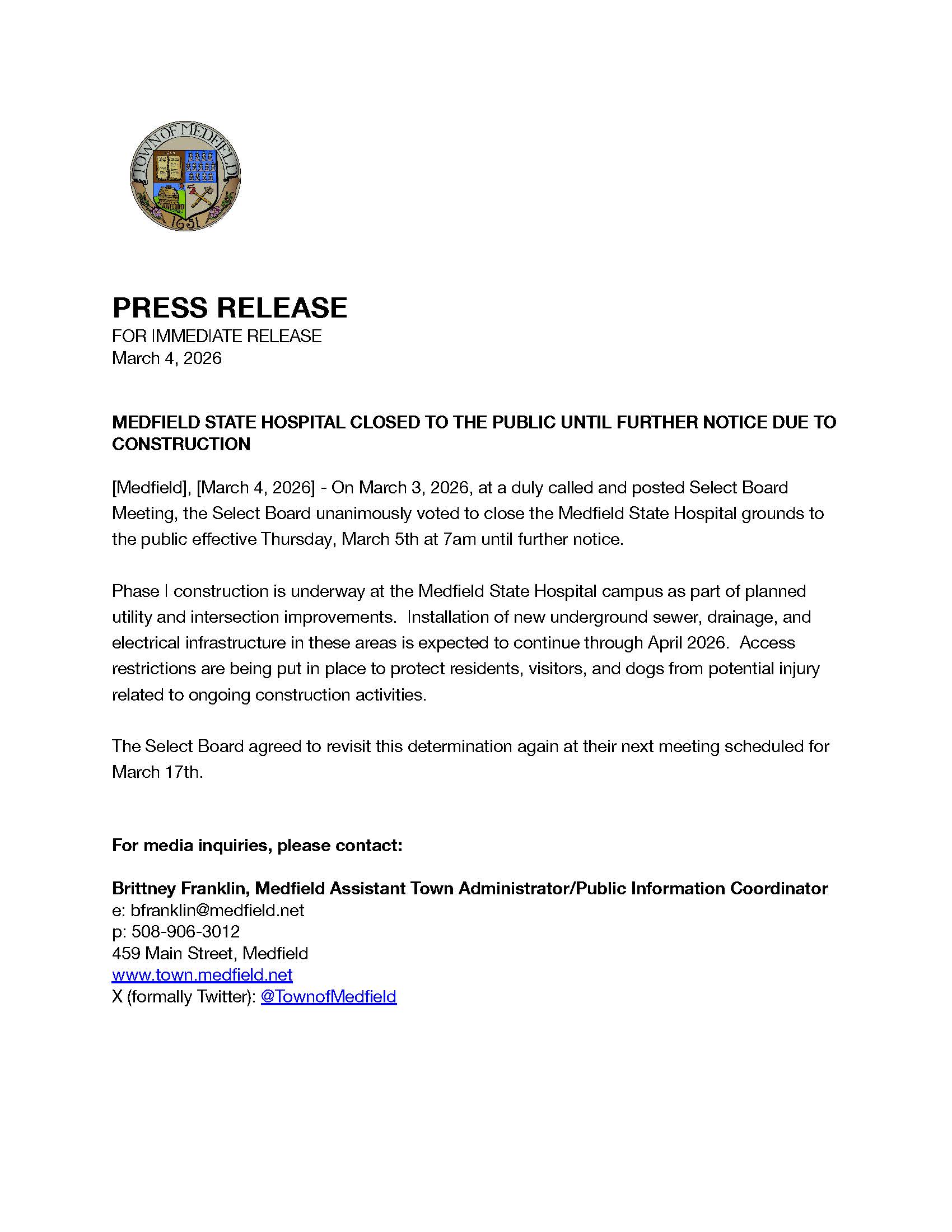 [Medfi eld], [March 4, 2026] - On March 3, 2026, at a duly called and posted Select Board Meeting, the Select Board unanimously voted to close the Medfi eld State Hospital grounds to the public eff ective Thursday, March 5th at 7am until further notice.