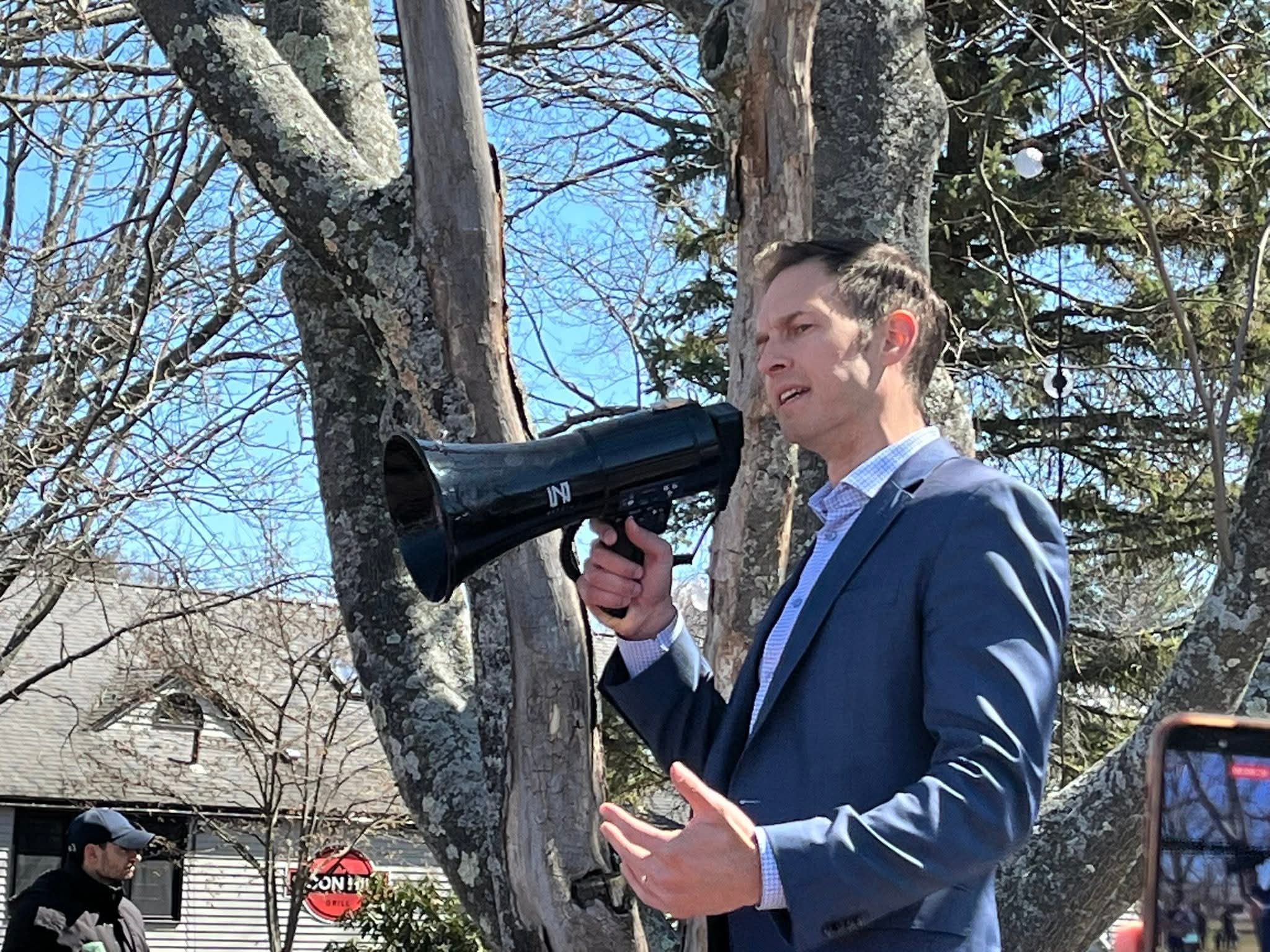 Congress Jake Auchincloss addressing the crowd at Baxter Park