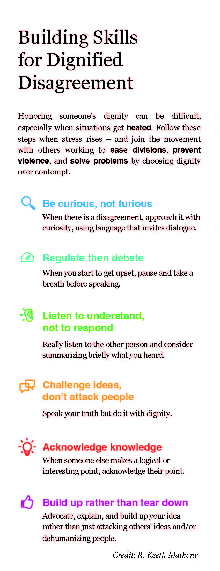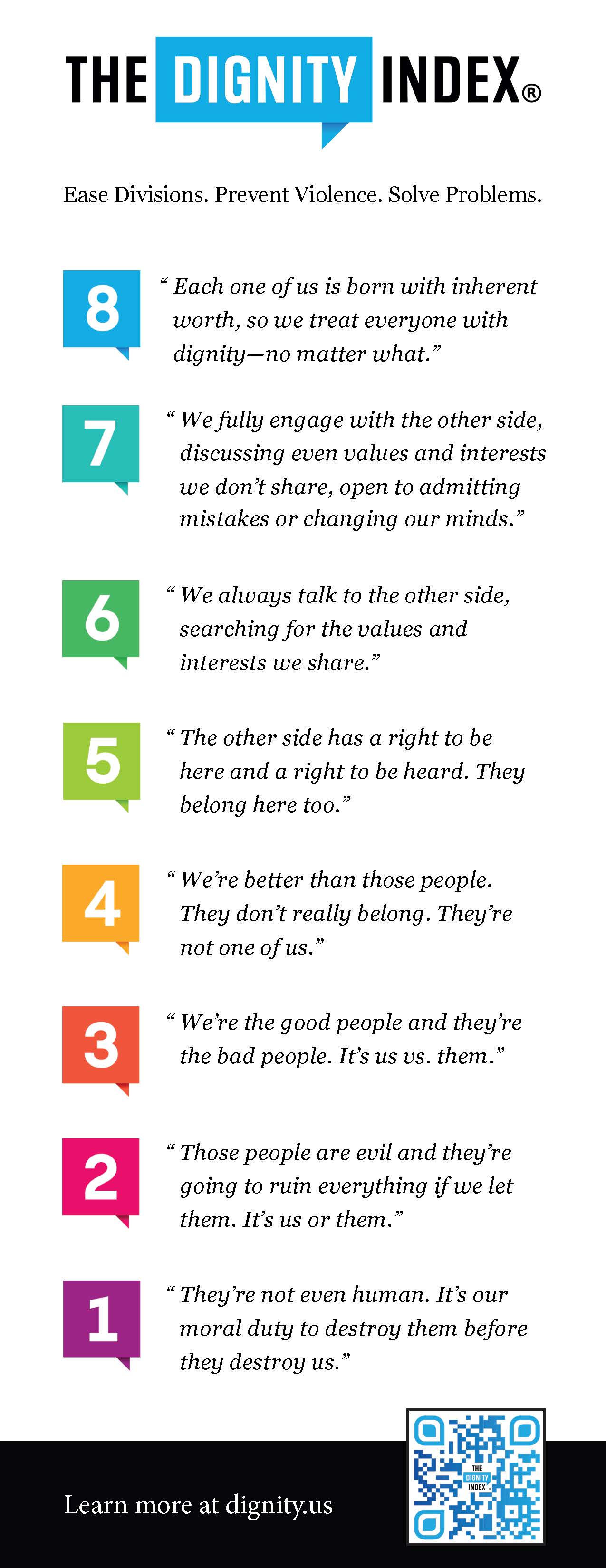 The Massachusetts Municipal Association had Tim Shriver speak to everyone at the opening of the Massachusetts Municipal Association annual convention this year in January about his Dignity Index, a way to lower the tone of disagreements in our political discourse. At first I discounted the value of the presentation, but after listening to him I think we all could do better by following his suggestions to measure our conversations against the Dignity Index and try to get ourselves to the Dignity Index 7 & 8 levels in our discussions with others: