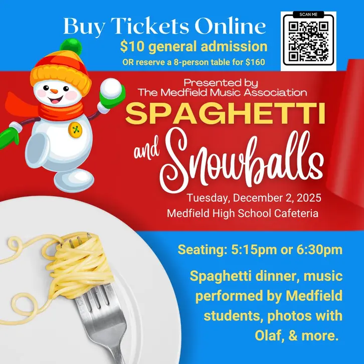 Join us for spaghetti, holiday music by Medfield orchestra, band and chorus students, a bake sale, gift basket raffles, and photos with Olaf! Let’s make this year’s event unforgettable.