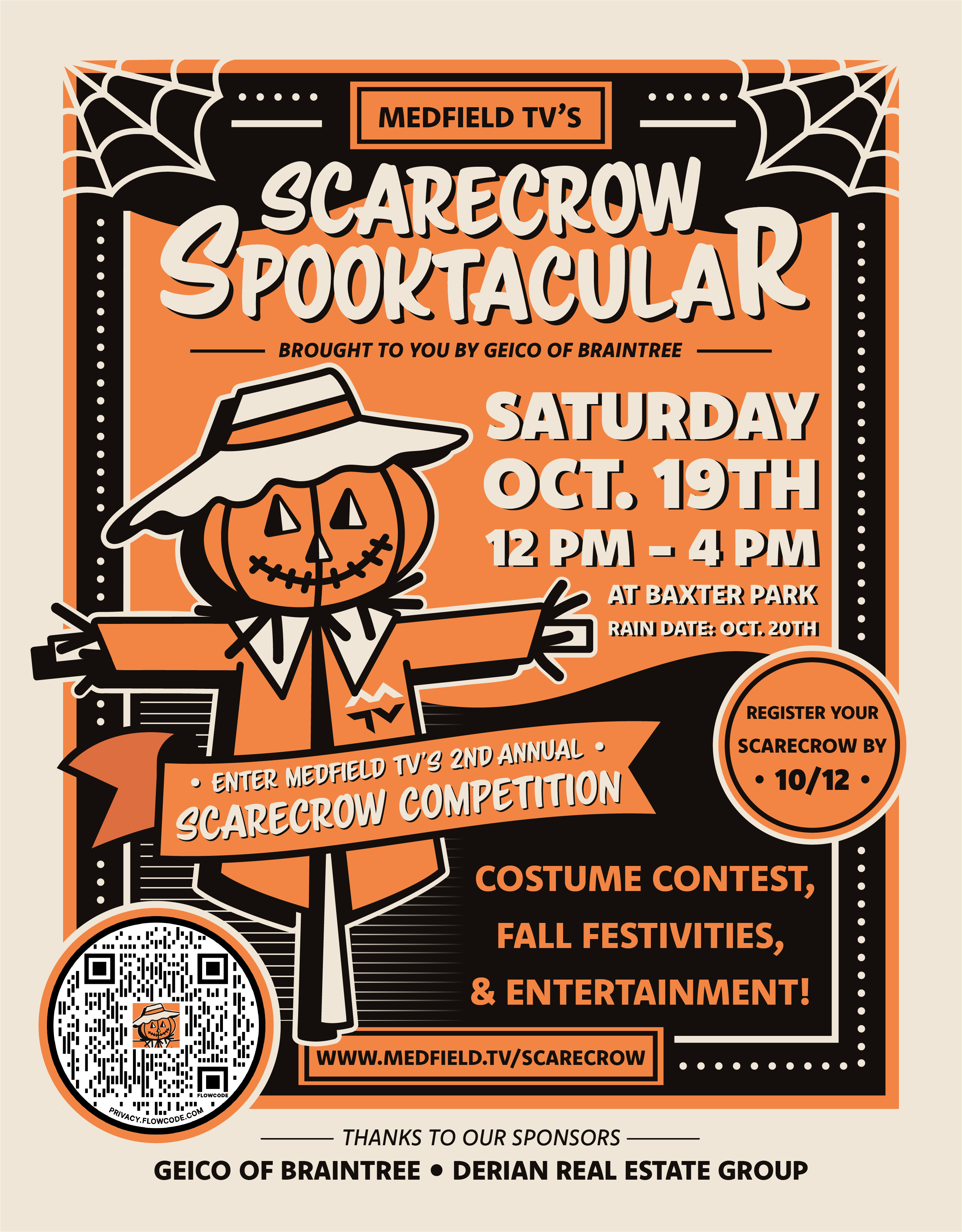 Medfield TV’s 2nd Annual Scarecrow Spooktacular festival is scheduled for Saturday, October 19th from 12:00 PM – 4:00 PM at Baxter Park in Medfield, MA. This all-ages event will bring a jack-o-lantern-sized smile to your face this Fall!
