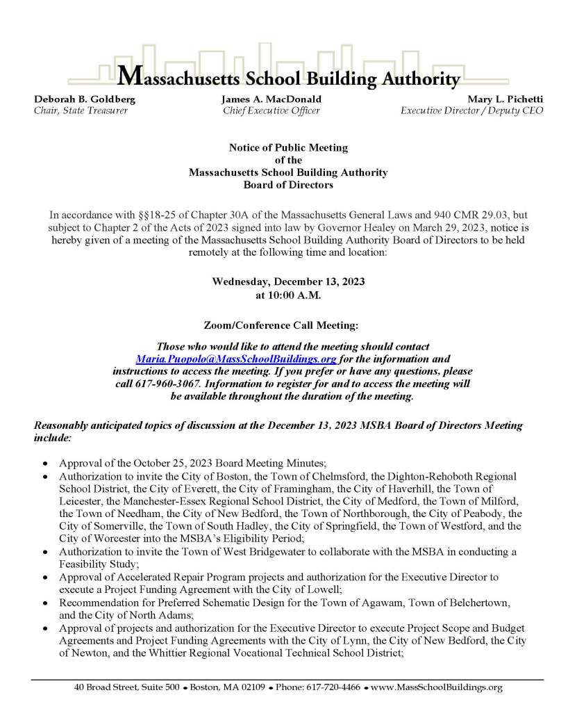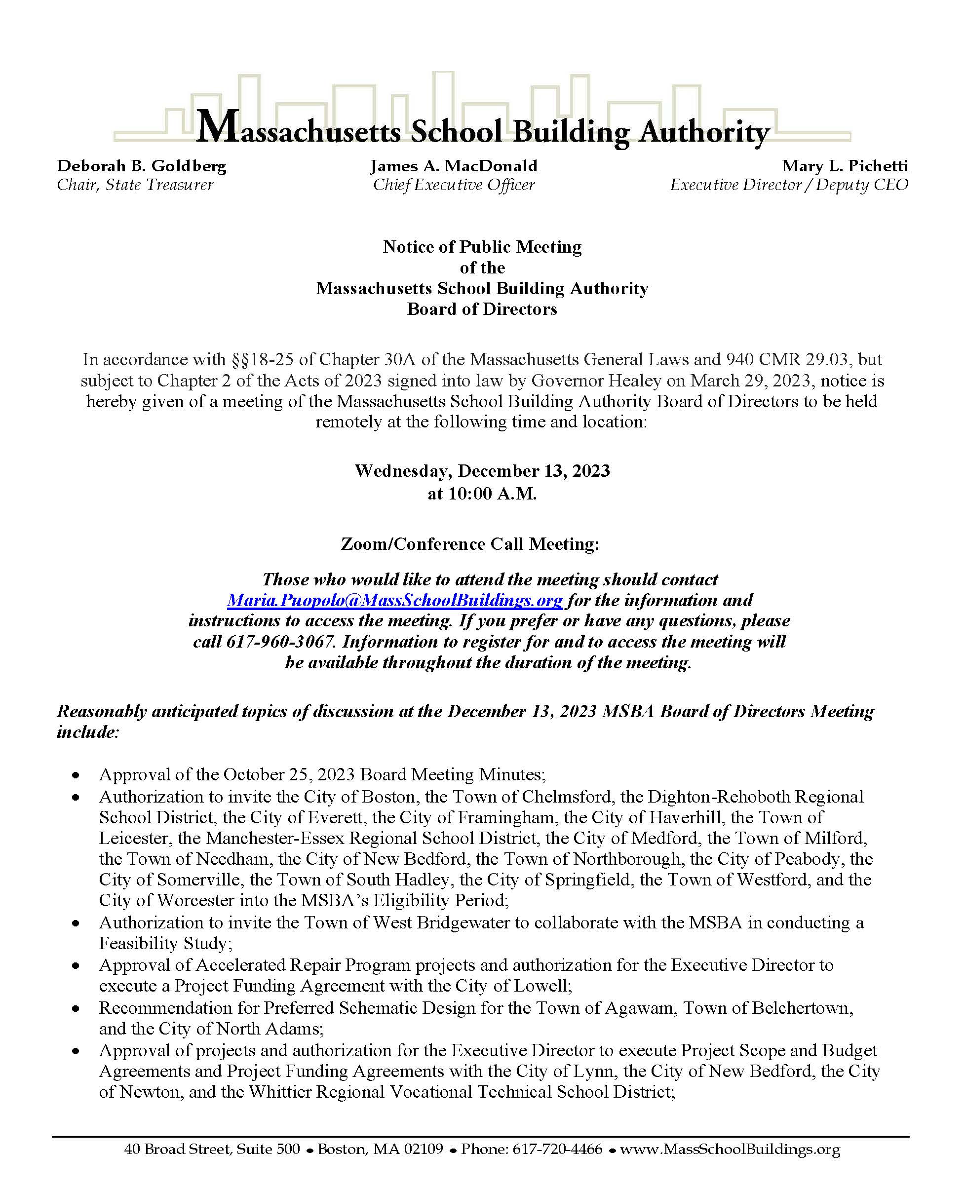 For school buildings, the FY24 budget includes $50 million for the new Green School Works program, providing grants to school districts for clean energy infrastructure, $100 million in supplemental grants to mitigate cost increases at school construction projects previously funded by the MSBA and an increase in the MSBA’s statutory cap to $1.2 billion.