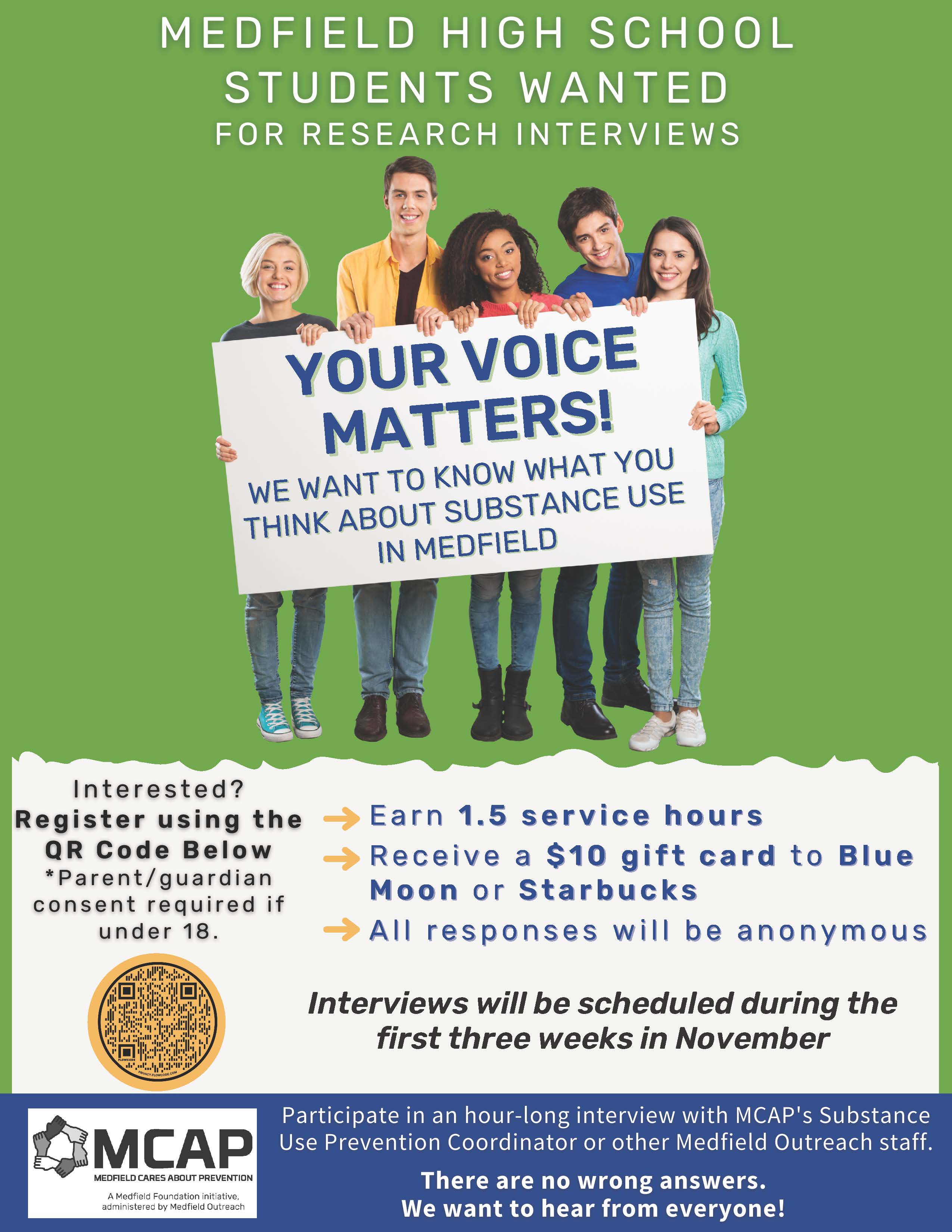 Medfield Cares About Prevention (MCAP) is currently seeking 10-12 high school-aged volunteers to participate in one-on-one interviews with the substance use prevention coordinator or another Medfield Outreach staff about substance use in Medfield. Students will not be asked about their own personal substance use or behaviors, but only to reflect upon what they see in their community. All information gathered during these interviews will be anonymized (no one will know who said what). Furthermore, the information collected will serve to help our MCAP coalition design impactful prevention strategies. These interviews will take anywhere from 30 minutes to one hour and are available both in person or via Zoom. All interviews will take place during the first three weeks of November.