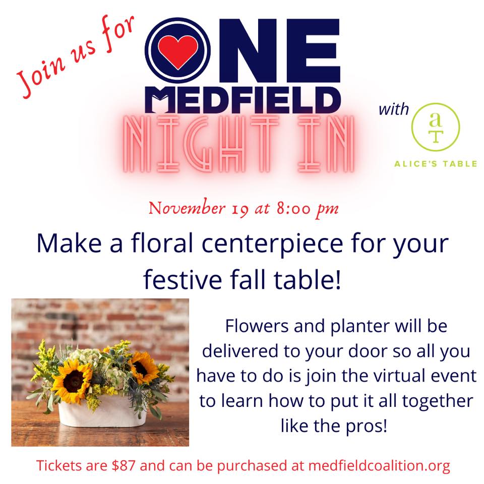 Then, on November 19 at 8:00pm, MCPE launches its βMedfield Night Inβ series with a virtual flower arranging class in conjunction with Aliceβs Table. All you need are scissors and water. Fall flowers and a decorative container will be delivered to your door, anywhere in the USA, the day before the class. Sign up now for one of the few remaining spots!