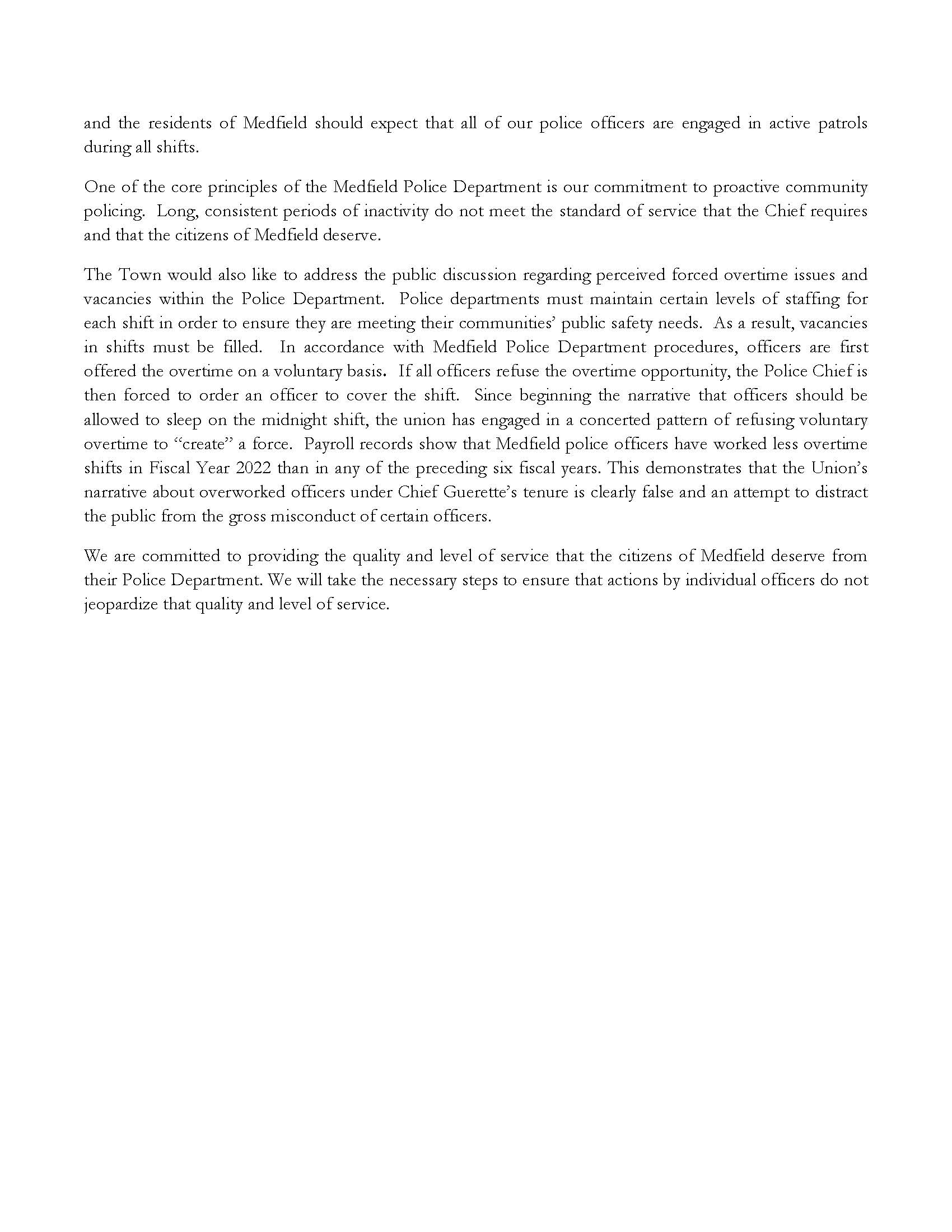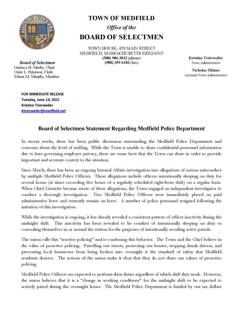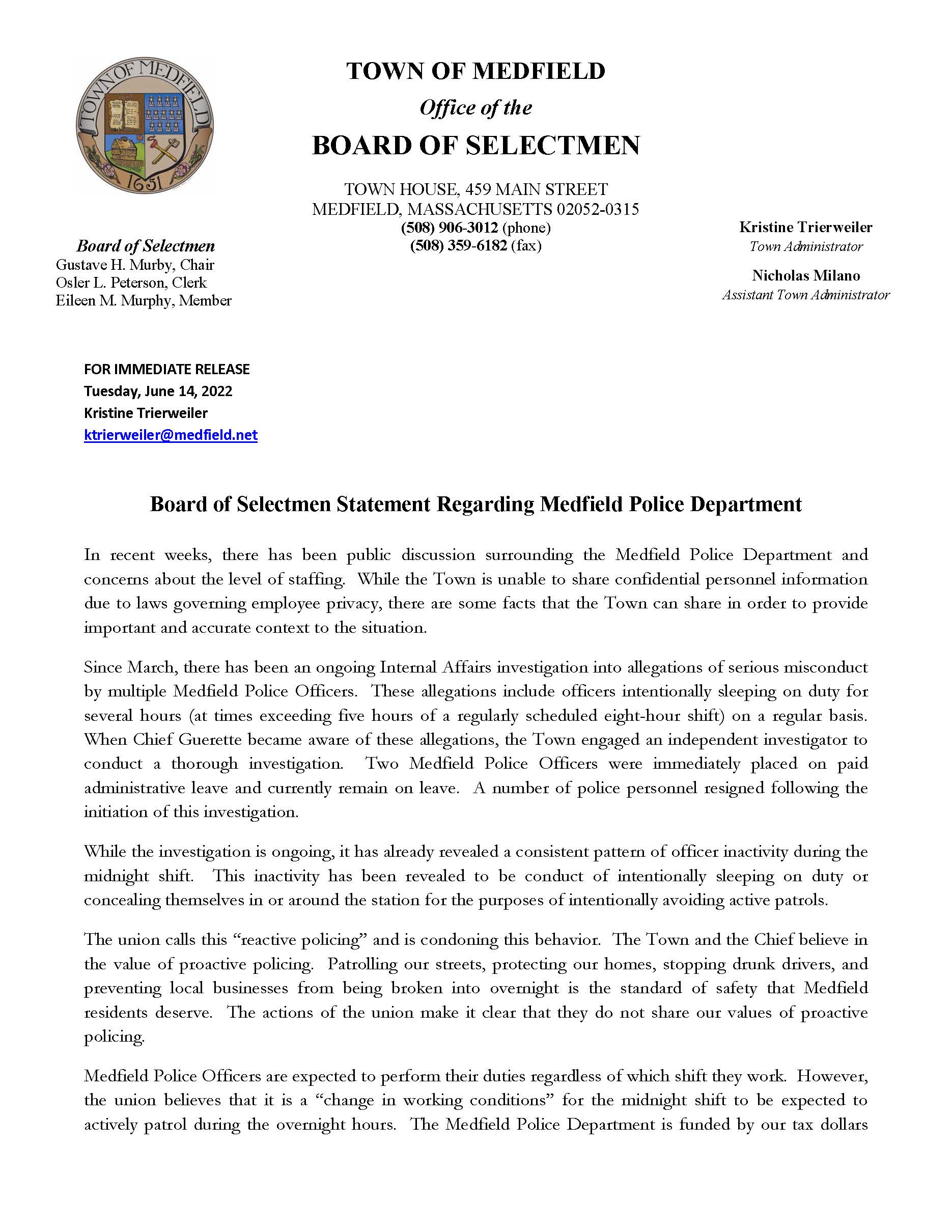 The Medfield Police and Medfield Public Schools are always in constant communication and have a collaborative approach to ensure the safety and well-being of all students and staff. We remain committed to working together to provide a safe, secure, and comfortable learning environment for all students.