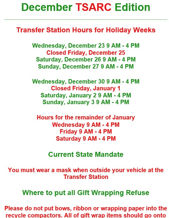 April TSARC Edition Please attend Town Meeting May 1 at 7 PM at the High School Auditorium SWAP Opening and Setup The SWAP Area will be opening up on May 3rd at 9 AM We need volunteers to help get the tents ready for Opening Day. Please email Nancy if you are able to help. The possible setup days (depending upon weather) are: Sunday, April 23 Wednesday, April 26 Saturday, April 29 Sunday April 30 medfieldswapshop@gmail.com Curb Alerts have begun again Please sign up on the SWAP SHOP Facebook Page https://www.facebook.com/medfieldswapshop Medfield town Clean-up days – April 22 and 23 You can help clean the town up for Earth Day Visit the DPW Office at the Town Hall for Trash bags and Clean-up locations You can make a difference! Climate Week is April 29 – May 7 Please join in for some Informational and Fun events. There’s still time to recycle your old crayons! The collection box is in the Children’s room at the Medfield Public Library. This collection will be ongoing until the end of June. We are hoping to get a large number to send in for recycling. All sizes and shapes of crayons are accepted. Little stubby ones are just as welcome as the big hardly used ones. TSARC Recycling Tips TIP 67 It’s easy to pop frozen food in the microwave for a quick meal or snack. It’s equally easy to dispose of the frozen food boxes properly – toss them quickly in the trash. Why? Frozen Food boxes have a thin layer of plastic sprayed onto the paper to prevent freezer burn. Recycling only works if like materials are together. So the thin “polycoat” that prevents food from spoiling also prevents the paper fiber from breaking up in the recycling process. TIP 68 Spring is a popular season for graduations, weddings, showers and other celebrations. If you’re a lucky gift recipient, though, keep in mind that most gift wrap cannot be recycled. Wrapping paper is often dyed, laminated and/or contains non-paper additives such as gold and silver shapes, glitter, plastics and more which cannot be recycled. If you’re a gift giver, consider creative alternatives to wrapping paper. Wrap a budding journalist’s gift in a newspaper, consider magazine pages for a fashionista’s gift, brown paper bags tied with twine give packages a rustic farmhouse charm, and comics, of course, are always a fun option – no matter what the age of the recipient! And, gift bags which can be reused, are also an earth-friendly choice. Not sure what to do? Go to https://recyclesmartma.org Reuse instead of buying new! More items from the Library of Things at the Medfield Public Library You only need a library card to borrow any of these items! Need a small laptop? Thinking about purchasing one but would like to try before you buy, or maybe you need it for a specific short-term task. This Chromebook would be great Movie night and you want something other than Microwave Popcorn? This Popcorn maker will make enough for the whole family and then some. Need to put in a fence or replace your mailbox post? Borrow the pole digger so you don’t need to buy one for a one time need. Purchase a backyard Compost Bin! A limited number remain! The Transfer Station and Recycling Committee seeks to know how many residents would like to buy a compost bin at the Mass DEP subsidized price of $25 (+ $1.56 state tax). The minimum order for the Town would be 20 compost bins. Please contact Barb Meyer if you are interested in purchasing a compost bin with subject line: “compost bin”. bwmp2052@verizon.net Name the Compactors! Don’t you think our compactors need names? They look rather forlorn just sitting there with no personalities. Contest is open to all ages! Email your first & last name & your ideas to: MedfieldTSARC@gmail.com Limit 4 names per person Contest runs: 5/5-6/5 Names will be selected based on creativity Be silly, be serious, but have FUN! Two winners will get a $10 Park Street Book gift card, a picture in Hometown Weekly and a spotlight video on Medfield TV ! 0 Compactor #1 Compactor #2 Transfer Station Hours April Wednesday 9 AM – 4 PM Friday 9 AM – 4 PM Saturday 9 AM – 4 PM Sunday 9 AM – 4 PM May Wednesday 9 AM – 4 PM Friday 7:30 AM – 4 PM Saturday 9 AM – 4 PM Transfer Station Stickers Transfer Station Stickers will be expiring on June 30, 2023. The new stickers will be available starting May 1, 2023 at the DPW office in Town Hall. The applications will also be distributed with the water and sewer bills. |